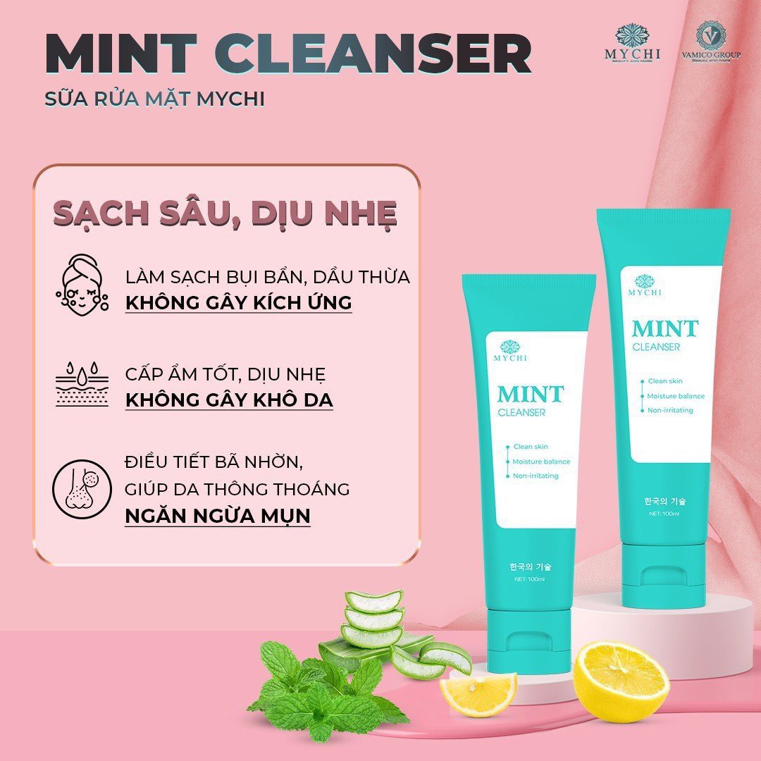 - Sữa Rửa Mặt Mint Cleanser Mychi là sản phẩm làm sạch da vô cùng dịu nhẹ, an toàn, dùng được cho da nhạy cảm đến từ Mỹ phẩm Mychi