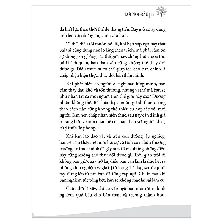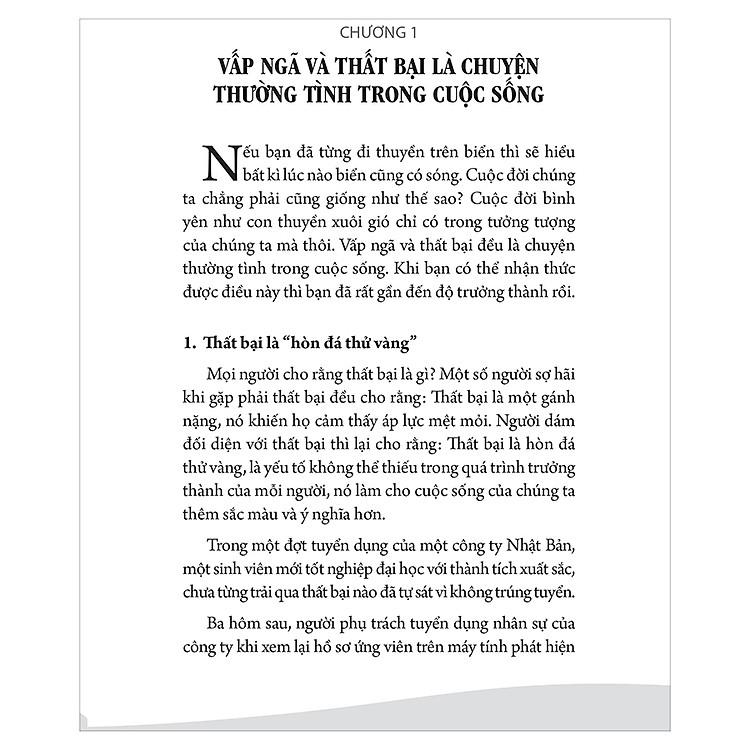 Mỗi Lần Vấp Ngã Là Một Lần Trưởng Thành Cuộc đời là quá trình không ngừng trưởng thành. Trong quá trình này, bạn sẽ khó tránh khỏi vấp ngã, sẽ trải qua nhiều lần đau thương, và sẽ có những lúc bạn cảm thấy vô cùng mỏi mệt, nhưng hãy tin rằng, chỉ có những người đã từng đau thương thì mới trở nên vững vàng hơn. Mỗi chúng ta từ nhỏ đến lớn, dù ít dù nhiều đều đã từng trải qua những lúc cảm thấy đau khổ, đây chính là trở ngại mà chúng ta thường nói tới. Tôi tin rằng sẽ không một người nào dám khẳng định cuộc đời của họ chẳng bao giờ gặp trở ngại. Đó chính là cuộc sống. Nhưng mong bạn suy nghĩ kĩ, mỗi khi bạn gặp phải khó khăn hoặc vấp ngã, ngoài việc cảm thấy đau khổ về mặt tinh thần, bạn còn học được điều gì? Tôi dám khẳng định rằng bạn đã có được kinh nghiệm, và khi đã lĩnh hội, bạn sẽ không vấp ngã lại nơi bạn đã từng ngã. Đây chính là sự trưởng thành. Đặc biệt, khi bạn rời xa vòng tay che chở, bao bọc của cha mẹ và nhà trường, bước chân vào xã hội, bạn sẽ gặp phải rất nhiều trở ngại và nhận ra xã hội này vốn không hề đơn giản như bạn tưởng tượng! Bạn cũng sẽ nhận ra khi bạn đau buồn hay gặp phải khó khăn, sẽ không có ai để ý đến sự tủi thân của bạn và cũng chẳng quan tâm đến sự bất lực của bạn. Thậm chí bạn cũng không muốn kể cho cha mẹ nghe vì sợ họ phải lo lắng cho mình, bạn chỉ có thể tự mình giải quyết, tự mình gánh chịu.