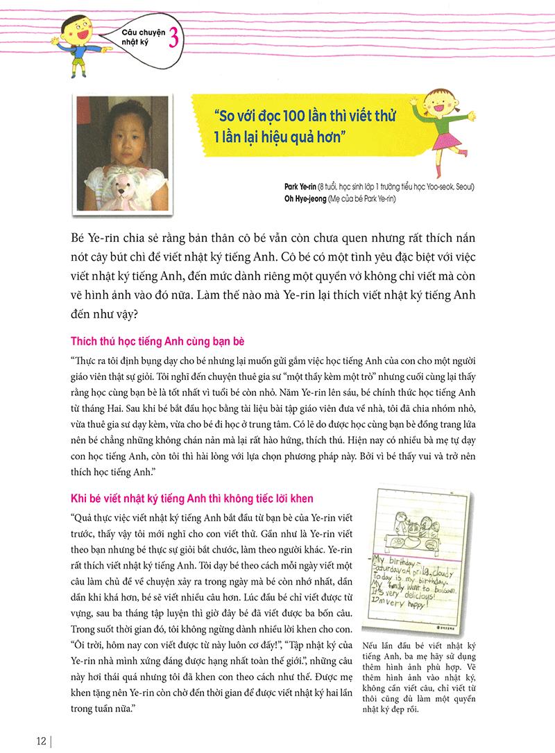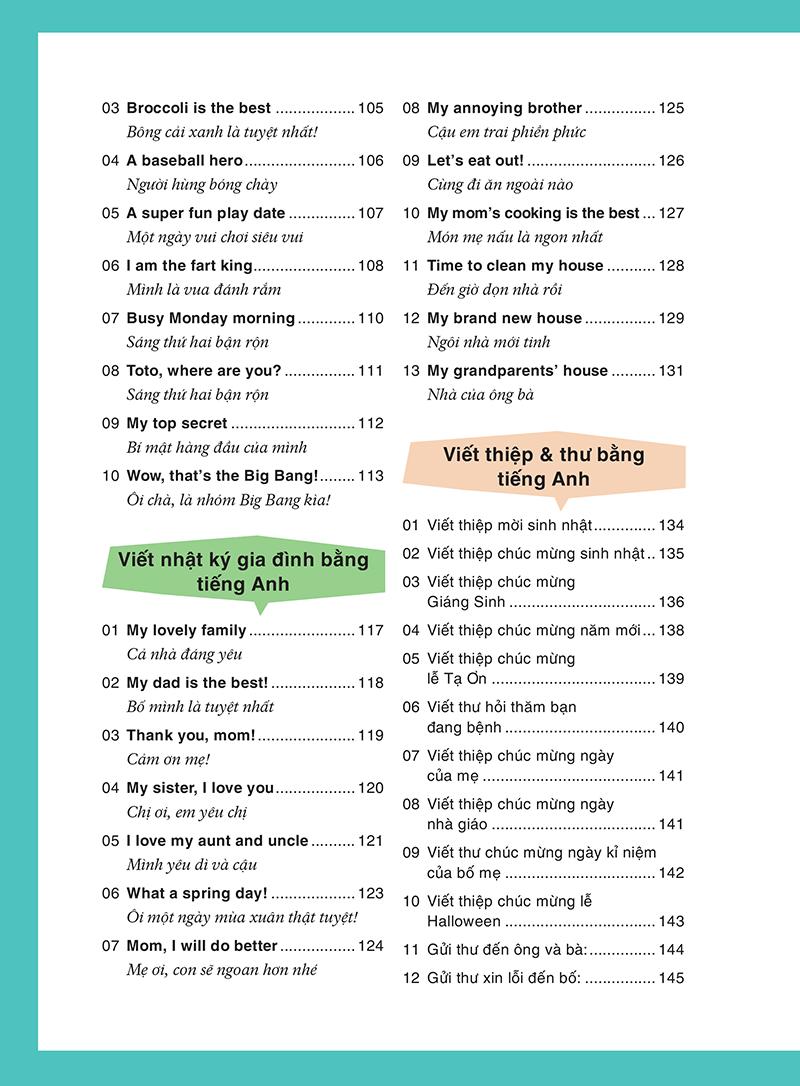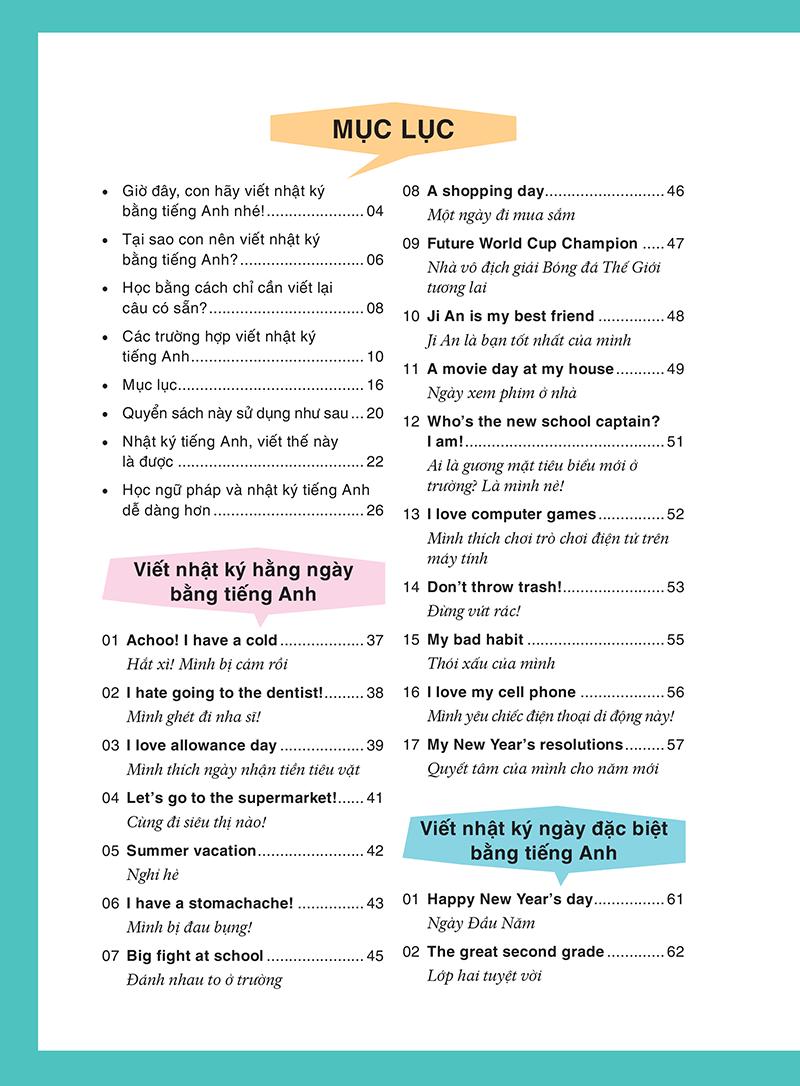 Quyển sách này được tác giả tổng hợp thành bốn hình thức nhật ký, cách viết thiệp và thư để giúp các bạn nhỏ thể hiện tấm lòng của mình bằng Anh ngữ. Hãy bắt chước và luyện tập thường xuyên, vì học sai mới gây sợ hãi, còn học đúng luôn tạo hứng thú cho các bé.