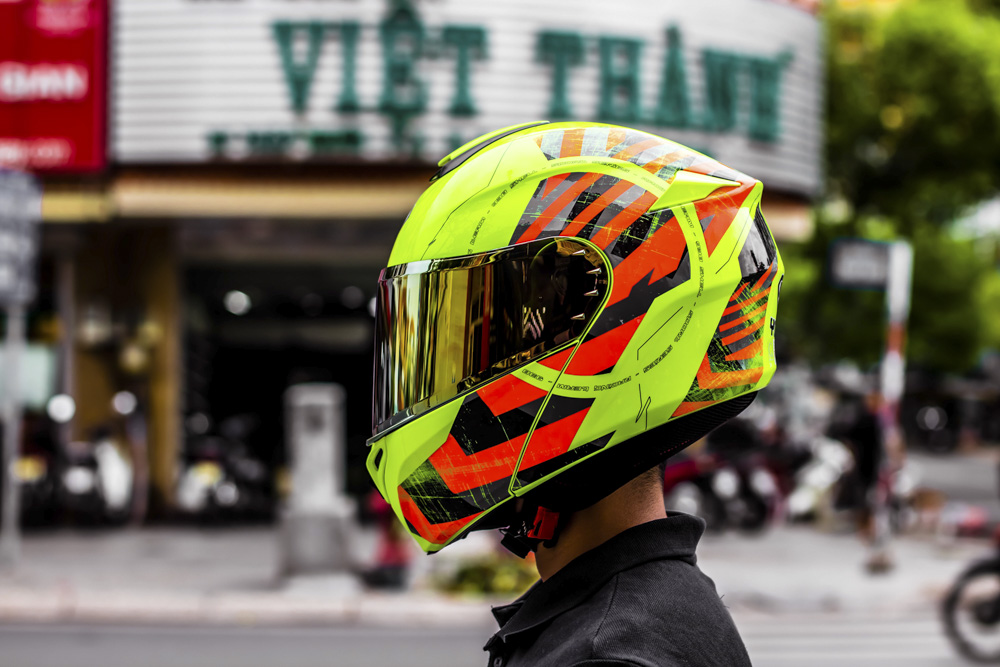 Phần hàm có thể lật lên 90 độ để biến chiếc mũ từ fullface thành mũ 3/4 khi đi nội thành. Với phần chốt hàm được thiết kế bên dưới cùng với đệm cằm mang lại tính thẩm mỹ cao.