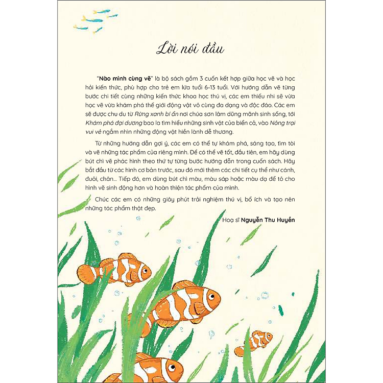 Nào Mình Cùng Vẽ gồm 3 tập sách kết hợp giữa học vẽ và học hỏi kiến thức, phù hợp cho trẻ em lứa tuổi 6-13 tuổi. Thông qua những hướng dẫn vẽ chi tiết từng bước cùng những kiến thức khoa học bên lề thú vị, các em thiếu nhi sẽ vừa học vẽ vừa khám phá thế giới động vật vô cùng đa dạng và độc đáo.