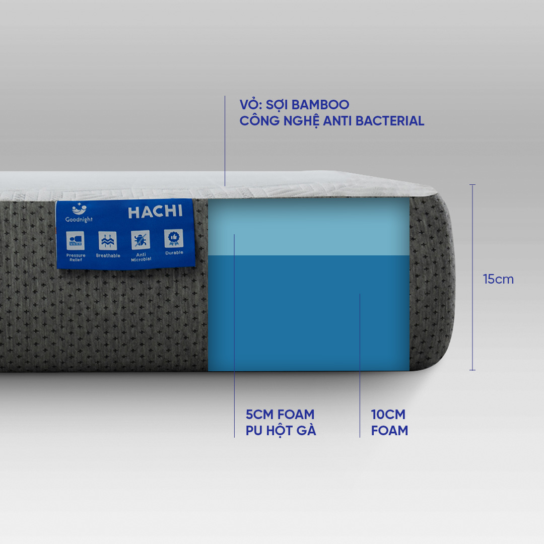 SẢN PHẨM MỚI NĂM 2024 đến từ VUA NỆM NỆM FOAM GOODNIGHT HACHI - NHÂN ĐÔI ÊM ÁI, KHÁNG KHUẨN HIỆU QUẢ, GIẢI PHÓNG ÁP LỰC CƠ THỂ Với độ dày lý tưởng 15cm cùng cấu trúc 2 lớp foam đặc biệt, nệm foam Goodnight Hachi không chỉ mang lại cảm giác êm ái mà còn giúp giảm áp lực cơ thể, tạo nên giấc ngủ chất lượng. Lớp vỏ nệm kháng khuẩn hiệu quả giúp không gian ngủ của bạn được bảo vệ, đảm bảo luôn luôn sạch sẽ và an toàn. Hãy chọn Nệm Foam Goodnight Hachi để chăm sóc sức khỏe, nâng cao chất lượng giấc ngủ cho bản thân và gia đình, một quyết định thông minh cho cuộc sống hàng ngày của bạn. Ưu điểm có tại nệm foam Goodnight Hachi