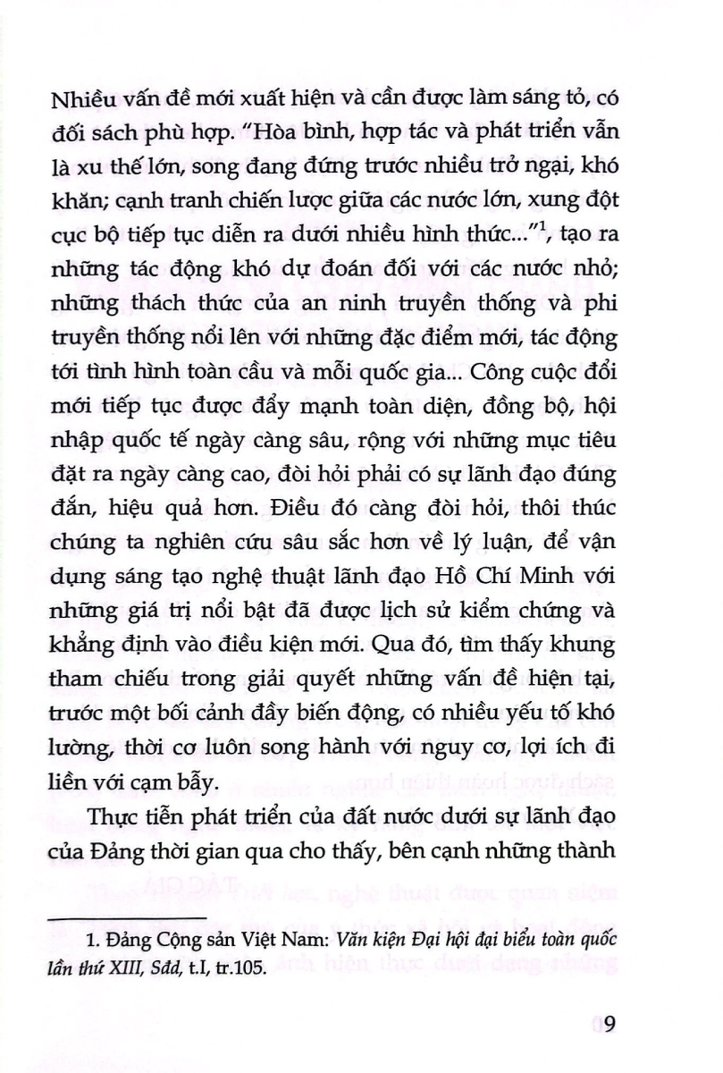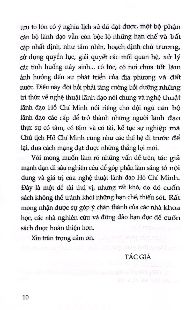 Nghệ Thuật Lãnh Đạo Hồ Chí Minh Với mong muốn đi sâu nghiên cứu, làm rõ nét đặc sắc trên, Nhà xuất bản Chính trị quốc gia Sự thật xuất bản cuốn sách Nghệ thuật lãnh đạo Hồ Chí Minh của TS. Đào Đình Tuấn. Nội dung cuốn sách đã bước đầu tập trung luận giải những vấn đề cơ bản sau: Một là, làm rõ cách hiểu, phương pháp tiếp cận để nghiên cứu nghệ thuật lãnh đạo Hồ Chí Minh và cơ sở lý luận, thực tiễn cũng như nhân tố chủ quan hình thành nghệ thuật lãnh đạo Hồ Chí Minh. Hai là, trên cơ sở nghiên cứu tư tưởng, thực tiễn lãnh đạo cách mạng của Chủ tịch Hồ Chí Minh, tác giả bước đầu đã hệ thống hóa và làm nổi bật những nội dung chủ yếu trong nghệ thuật lãnh đạo của Người. Đó là, nghệ thuật xác định mục tiêu, xây dựng tầm nhìn lãnh đạo; thuyết phục đối tượng lãnh đạo; tổ chức và sử dụng lực lượng cách mạng; sử dụng quyền lực; nắm bắt thời cơ; xử lý tình huống. Các nội dung này, có mối quan hệ chặt chẽ với nhau, thống nhất với nhau, góp phần tạo nên nghệ thuật lãnh đạo đặc sắc – nghệ thuật lãnh đạo Hồ Chí Minh. Ba là, làm rõ giá trị sâu sắc của nghệ thuật lãnh đạo Hồ Chí Minh trên hai phương diện lý luận và thực tiễn đối với cách mạng Việt Nam, cách mạng thế giới, với nghệ thuật lãnh đạo cách mạng và với Đảng Cộng sản Việt Nam. Tuy mới chỉ là bước đầu nghiên cứu về nghệ thuật lãnh đạo Hồ Chí Minh nhưng cuốn sách góp phần cung cấp cho bạn đọc thêm những cách tiếp cận để thấy được những đóng góp to lớn và giá trị bền vững mà Hồ Chí Minh để lại cho chúng ta.