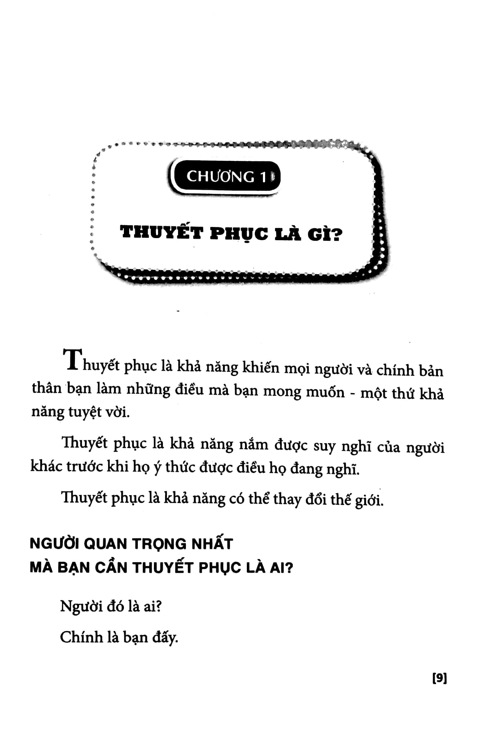 Khả năng thuyết phục có thể giúp bạn giành được nhiều hơn những gì bạn muốn nhanh hơn bất kỳ kỹ năng nào khác. Đó có thể là ranh giới giữa thành công và thất bại. Nó có thể bảo đảm sự tiến bộ của bạn và giúp bạn sử dụng tất cả các kỹ năng, sở trường khác với hiệu quả cao nhất. Khả năng thuyết phục khiến khách hàng, ông chủ, đồng nghiệp và bạn bè tôn trọng và sẵn sàng giúp đỡ bạn. Khả năng thuyết phục người khác làm những gì bạn muốn họ làm sẽ biến bạn trở thành một trong những người quan trọng nhất trong cộng đồng của bạn.