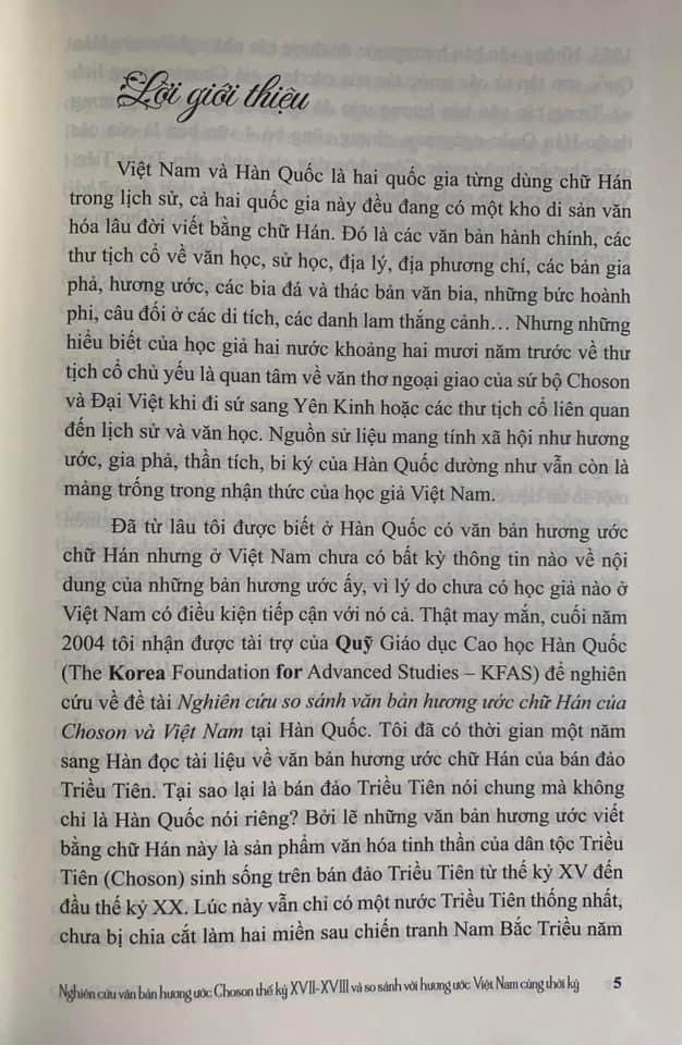 Hương ước của Triều Tiên và Việt Nam là đối tượng nghiên cứu của nhiều công trình khoa học của nhiều học giả trong và ngoài nước. Tuy nhiên, hiện nay chưa có một chuyên luận nào nghiên cứu một cách hệ thống hương ước chữ Hán của cả hai nước trong giai đoạn lịch sử cụ thể. Xuất phát từ tình hình hợp tác hữu nghị hai nước Việt Nam và Triều Tiên, nhu cầu nghiên cứu hương ước và tìm hiểu những nét dị đồng trong văn bản hương ước chữ Hán của Việt Nam và Triều Tiên trong một giai đoạn lịch sử nhất định, chúng tôi tiến hành nghiên cứu chuyên luận "Nghiên cứu văn bản hương ước Choson thế kỷ XVII- XVIII và so sánh với hương ước Việt Nam cùng thời kỳ". Sở dĩ chúng tôi chọn nghiên cứu hương ước chữ Hán ở thế kỷ XVII - XVIII vì vào thời kỳ này trong khi hương ước ở Triều Tiên đã được văn bản hóa, phát triển mạnh và có ảnh hưởng sâu đậm đến cách sống, ứng xử xã hội của người Triều, thì ở Việt Nam hương ước được văn bản hóa chỉ mới xuất hiện rải rác ở một số làng trong khi cả Việt Nam và Triều Tiên đều tiếp thu, chịu ảnh hưởng của Nho giáo và văn hóa Trung Hoa từ thởi kỳ cổ, trung đến cận đại. Biểu hiện cụ thể ở hai thế kỷ này là cả hai nước vẫn đưa ra nhiều chính sách khuyến khích Nho giáo, lập nên các trường Quốc học, ban bố quy định thi cử, đào tạo đội ngũ Nho quan phục vụ vương triều. Chuyên luận này với mong muốn chỉ ra những nét đặc sắc trong phong tục làng xã cổ truyền của hai nước đồng văn, trên hết là góp phần vào việc bảo tồn, chấn hưng văn hóa làng xã trong thời kỳ hội nhập và giao lưu trên thế giới. Nội dung phản ánh của hương ước hai nước rất phong phú, đa dạng bao quát toàn bộ đời sống xã hội của người dân hai nước bấy giờ. Vì vậy, nghiên cửu hương ước giai đoạn này là việc làm vừa mang ý nghĩa lý luận vừa mang ý nghĩa thực tiễn.