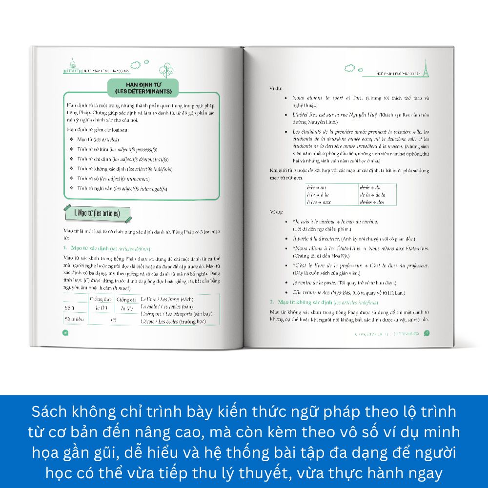 Sách - Ngữ Pháp Tiếng Pháp Cơ Bản - Dành cho người mới bắt đầu   Giới thiệu cuốn sách Ngữ pháp tiếng Pháp cơ bản Tiếng Pháp được mệnh danh là ngôn ngữ của sự lãng mạn, tinh tế và là một trong những ngôn ngữ chính thức của Liên Hợp Quốc, Liên minh châu Âu cũng như nhiều tổ chức quốc tế khác. Việc học tiếng Pháp không chỉ giúp bạn mở rộng cơ hội giao tiếp, du học và nghề nghiệp mà còn mang lại khả năng tiếp cận kho tàng văn hóa, nghệ thuật, văn học đồ sộ của nhân loại. Tuy nhiên, để làm chủ ngôn ngữ này, ngữ pháp luôn là nền tảng bắt buộc và quan trọng. Nhận thức được điều đó, cuốn “Ngữ pháp tiếng Pháp cơ bản” được biên soạn với mục tiêu trở thành cuốn tài liệu hệ thống và dễ tiếp cận nhất cho người học. Sách không chỉ trình bày kiến thức ngữ pháp theo lộ trình từ cơ bản đến nâng cao, mà còn kèm theo vô số ví dụ minh họa gần gũi, dễ hiểu và hệ thống bài tập đa dạng để người học có thể vừa tiếp thu lý thuyết, vừa thực hành ngay. Chính nhờ cách tiếp cận này, cuốn sách mang lại cảm giác học tập chủ động, giúp người học nhanh chóng nắm bắt cấu trúc ngữ pháp, tránh tình trạng học vẹt hay học xong lại quên. Với sự kết hợp hài hòa giữa lý thuyết, ví dụ và luyện tập, “Ngữ pháp tiếng Pháp cơ bản” thực sự là người bạn đồng hành lý tưởng cho mọi đối tượng – từ học sinh, sinh viên cho đến người đi làm, hay bất kỳ ai mới bắt đầu hành trình chinh phục tiếng Pháp.   Nội dung chính Nội dung sách được triển khai logic qua 28 bài học, bao trùm các chủ điểm ngữ pháp quan trọng: Bài 1: Danh từ (Les noms) Bài 2: Hạn định từ (Les déterminants) Bài 3: Tính từ chỉ tính chất (Les adjectifs qualificatifs) Bài 4: Trạng từ (Les adverbes) Bài 5: Động từ (Les verbes) Bài 6: Đại từ (Les pronoms) Bài 7: Bổ ngữ cho động từ (Les compléments d’objet) Bài 8: Dạng chủ động – bị động (Voix active – Voix passive) Bài 9: Các thì trong thức chỉ định (Les temps de l’indicatif) Bài 10: Thức điều kiện (Le conditionnel) Bài 11: Thức mệnh lệnh (L’impératif) Bài 12: Thức chủ quan (Le subjonctif) Bài 13: Phân từ và động danh từ (Le participe et le gérondif) Bài 14: Các loại câu (Les types de phrases) Bài 15: Câu tường thuật (Le discours rapporté) Bài 16: Mệnh đề phụ bổ ngữ (La subordonnée complétive) Bài 17: Mệnh đề phụ quan hệ (La subordonnée relative) Bài 18: Diễn đạt sự phủ định (La négation) Bài 19: Phép nhấn mạnh (Mettre en relief) Bài 20: Định vị trong không gian (Situations dans l’espace) Bài 21: Định vị trong thời gian (Situations dans le temps) Bài 22: Diễn đạt mục đích (Exprimer le but) Bài 23: Diễn đạt nguyên nhân (Exprimer la cause) Bài 24: Diễn đạt hệ quả (Exprimer la conséquence) Bài 25: Diễn đạt sự đối lập (Exprimer l’opposition) Bài 26: Diễn đạt sự nhượng bộ (Exprimer la concession) Bài 27: Diễn đạt điều kiện (Exprimer la condition) Bài 28: Diễn đạt sự so sánh (Exprimer la comparaison)   Điểm đặc biệt của cuốn sách