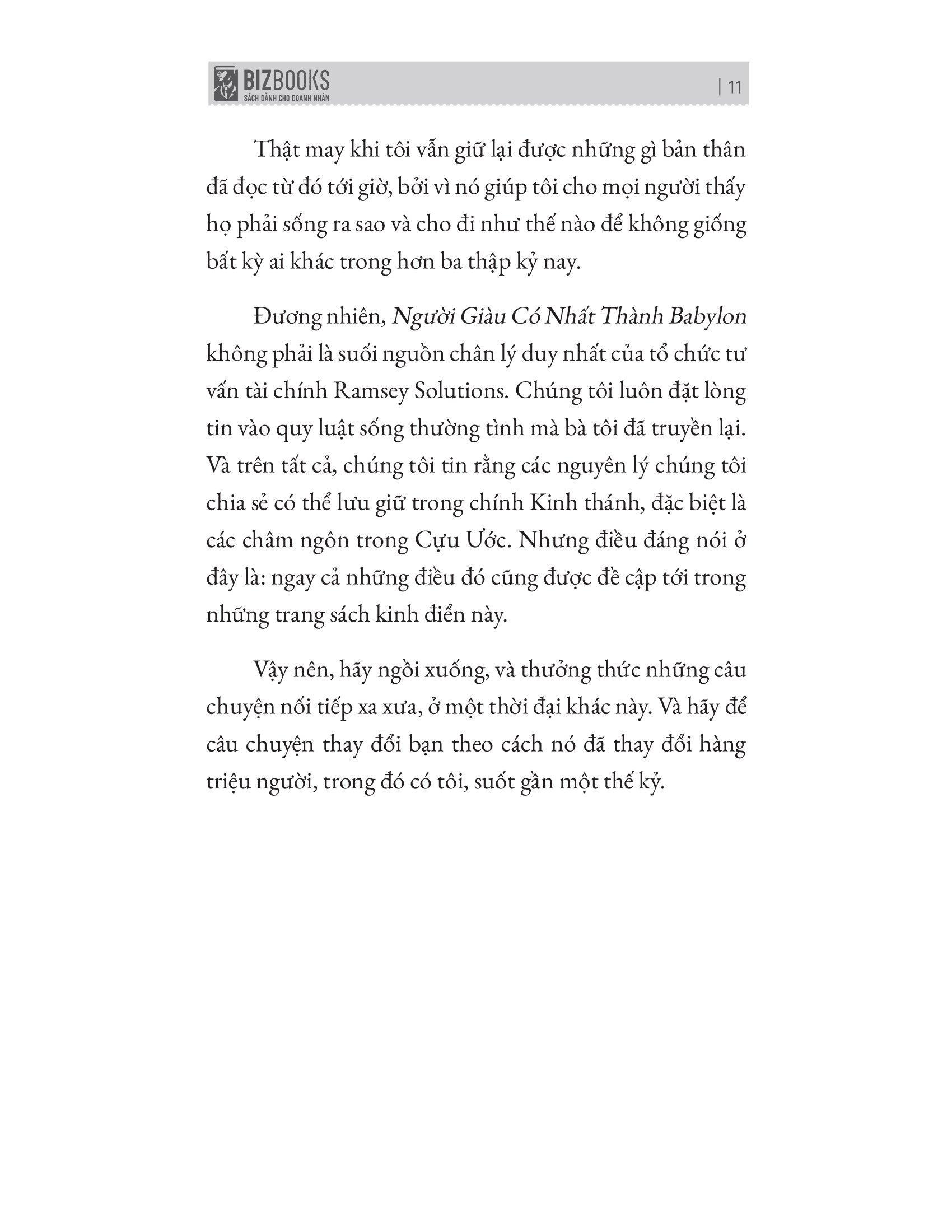 Cuốn sách Người giàu có nhất thành Babylon này sẽ đưa chúng ta trở lại vương quốc Babylon cổ đại, cái nôi nuôi dưỡng những nguyên lý cơ bản về tài chính mà giờ đây con người hiện đại đã kế thừa và vận dụng trên toàn thế giới. Cuốn sách không chỉ giúp bạn trở nên giàu có mà còn hướng dẫn bạn duy trì sự giàu có đó mỗi ngày chỉ bằng những khoản tiền tiết kiệm nhỏ mà không ảnh hưởng đến tài chính của bạn.