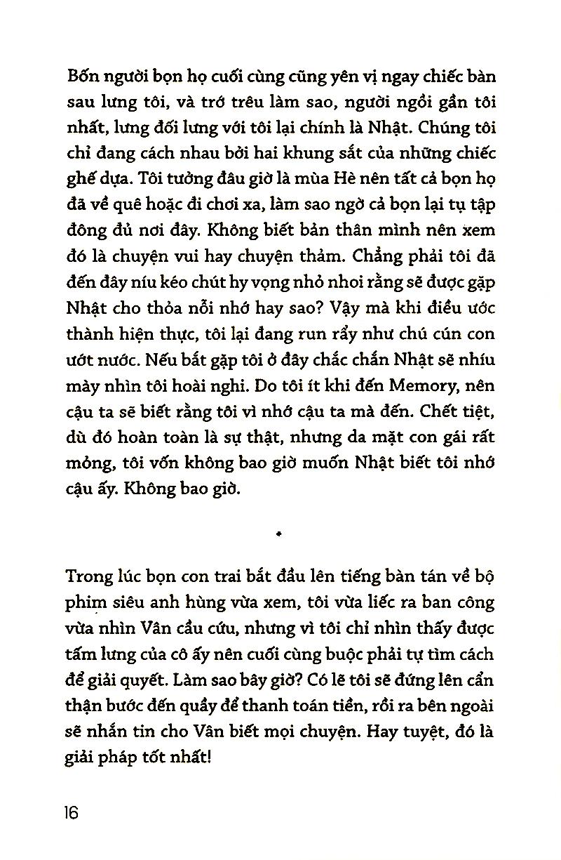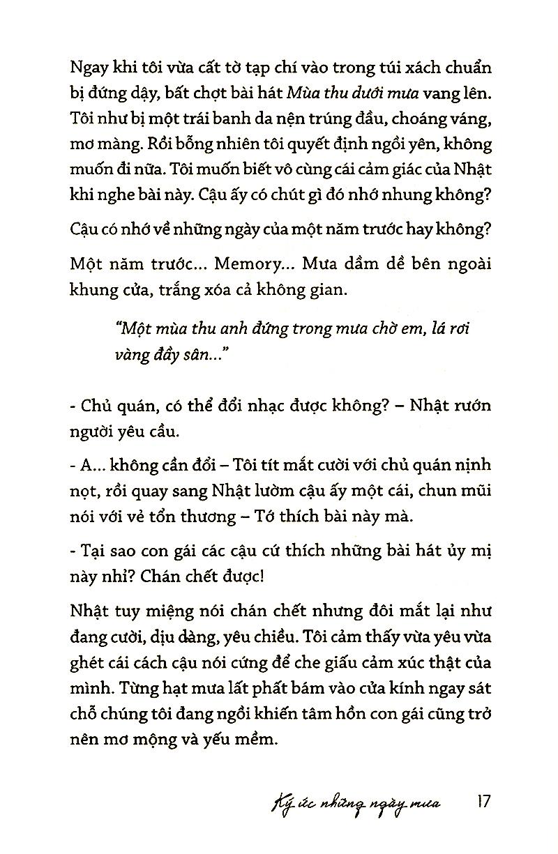 Người Kể Chuyện Tình Trên Phố Yêu Đương Phố Yêu Đương là tên gọi của một con đường sâu hun hút, dài thăm thẳm, và xa vời vợi. Giữa những năm tháng thanh xuân xem yêu thương như hơi thở, có những người bộ hành trẻ chỉ vừa đi qua vài căn nhà mà đã cảm thấy mỏi mệt thê lương, người khác lại vội vàng mừng rỡ ngỡ đâu đã tìm thấy nơi cần tìm là bến bờ hạnh phúc. Nhưng không phải vậy. Không bao giờ đơn giản như vậy. Quán trà Ký Ức là một quán nước nhỏ được dựng bằng gỗ, tọa lạc ở lưng chừng chặng đường của cuộc viễn du. Quán trà kỳ lạ này chỉ bắt đầu mở cửa hoạt động vào lúc trời tắt nắng, và duy nhất một cô gái trẻ có gương mặt khả ái với mái tóc màu khói tết thành bím dài thả sang một bên, là chủ nhân đồng thời là người phục vụ, đợi bạn dừng chân ghé vào ngơi nghỉ, sẽ thong thả vừa pha chế vừa kể cho bạn nghe vài câu chuyện tình nơi đó chốn đây. Và cô gái trẻ khả ái với mái tóc màu khói tết thành bím dài thả sang một bên đó, luôn tự gọi mình là… … Người Kể Chuyện Tình Trên Phố Yêu Đương.