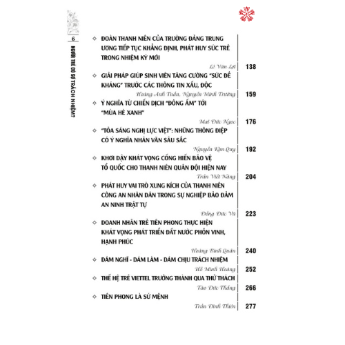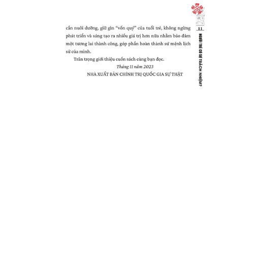 Các tác giả cùng trao đổi, chia sẻ quan điểm, suy nghĩ, trăn trở, thể hiện niềm tin, sự khẳng định đối với vai trò của người trẻ trong công việc và cuộc sống hiện nay; đưa ra những góc nhìn, đánh giá đúng đắn, khách quan về thế hệ trẻ và lý do tại sao cần trao cho họ những cơ hội, chính sách ưu tiên để phát triển. Đặc biệt, ý nghĩa xuyên suốt cuốn sách mà tập thể tác giả muốn gửi gắm là sự động viên, khích lệ thế hệ trẻ cần nuôi dưỡng, giữ gìn “vốn quý” của tuổi trẻ, không ngừng phát triển và sáng tạo ra nhiều giá trị hơn nữa nhằm bảo đảm một tương lai thành công, góp phần hoàn thành sứ mệnh lịch sử của mình. Trong đó, có một số bài tiêu biểu như: bài viết “Bệnh sợ trách nhiệm” của Tổng Bí thư Nguyễn Phú Trọng đăng trên Tạp chí Cộng sản năm 1973; “Vấn đề thanh niên trong tư tưởng Hồ Chí Minh” của GS.TS Tạ Ngọc Tấn, Phó Chủ tịch Thường trực Hội đồng Lý luận Trung ương; “Nâng cao hiệu quả công tác tư tưởng đối với thanh niên trong tình hình mới” của PGS.TS Lê Hải Bình, Ủy viên dự khuyết Trung ương Đảng, Phó Trưởng Ban Tuyên giáo Trung ương; “Trách nhiệm của đội ngũ công chức trẻ trong giai đoạn hiện nay” của PSG.TS Phạm Minh Tuấn, Phó Tổng biên tập phụ trách Tạp chí Cộng sản; "Học sinh, sinh viên, thanh niên dân tộc thiểu số rèn đức, luyện tài, phấn đấu vươn lên đóng góp vào sự phát triển của cộng đồng, dân tộc" của đồng chí Hầu A Lềnh, Ủy viên Trung ương Đảng, Bộ trưởng, Chủ nhiệm Ủy ban Dân tộc; “Làm thế nào để đội ngũ trí thức trẻ phát huy được trách nhiệm, hoàn thành tốt vai trò lịch sử của mình?” của GS.TS Phùng Hữu Phú.