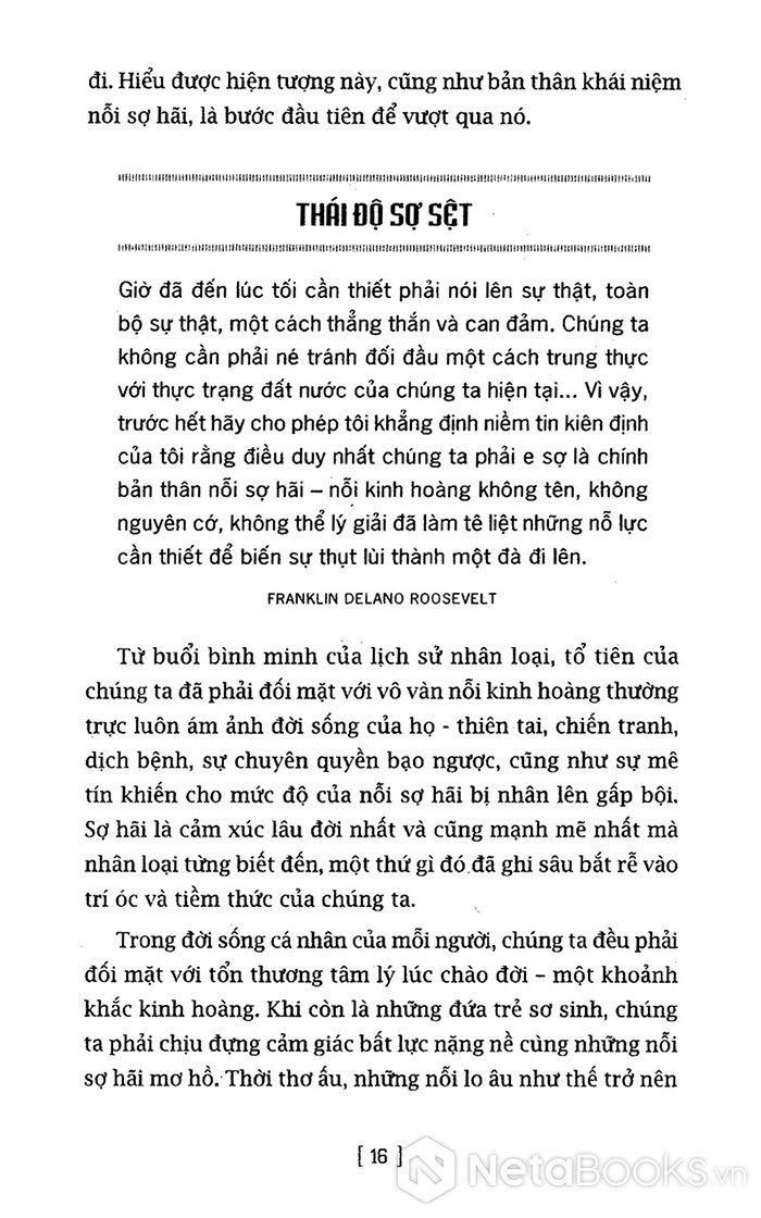 Sợ hãi là một trong những cảm xúc nguyên thủy nhất mà mỗi người cảm nhận được ngay từ lúc chào đời. Không ai thoát khỏi quy luật chung này. Vì vậy, vượt qua sợ hãi, với tất cả hình thức cung bậc đa dạng của nó, không phải là điều tự nhiên đến mà là kết quả của một quá trình nỗ lực kiên trì, có ý thức, có phương pháp. Robert Greene đã trình bày trong cuốn sách của mình, thông qua 10 chương sách, 10 chiến lược hành động khác nhau để vượt qua những khía cạnh khác nhau của cảm giác sợ hãi.