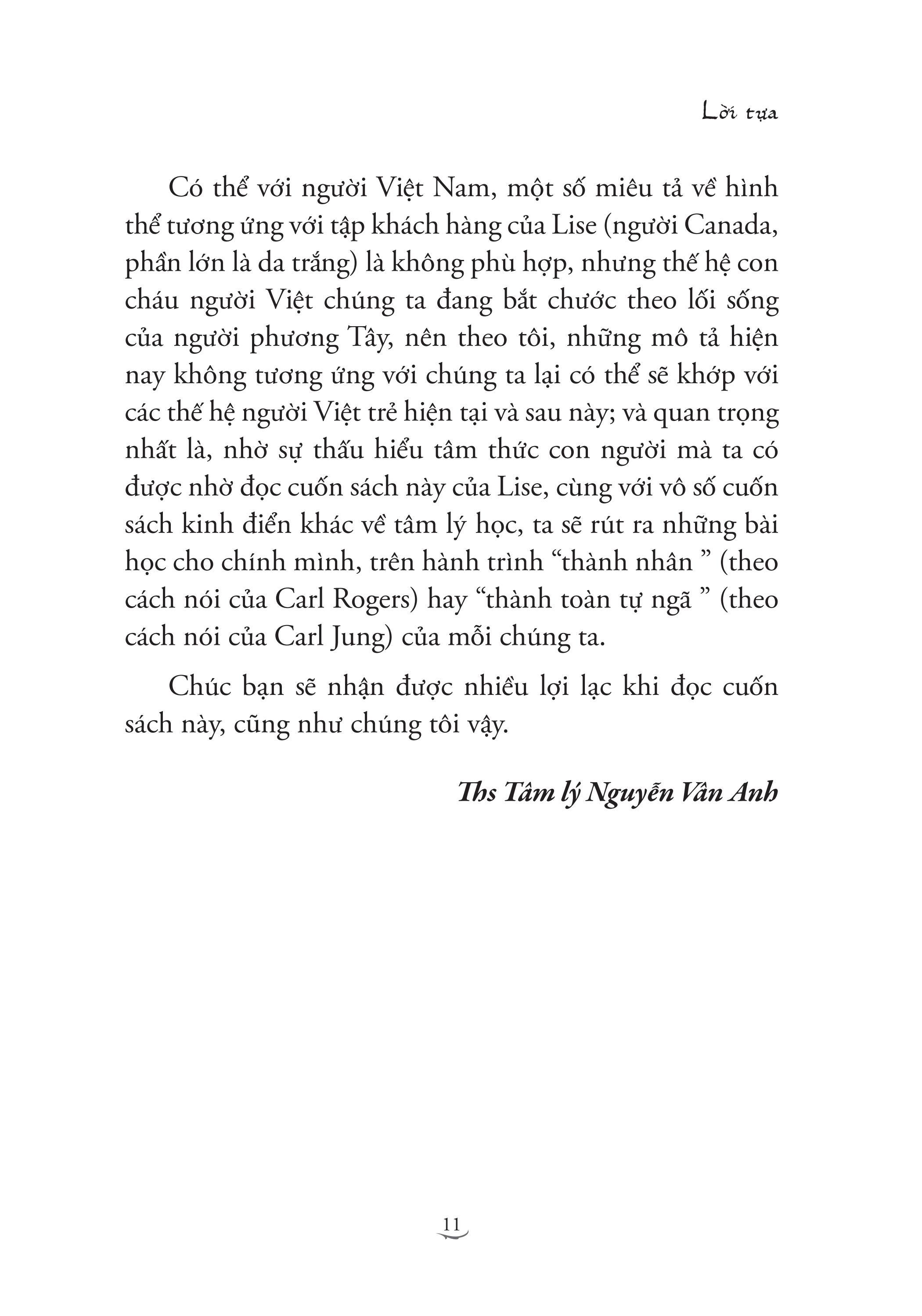 Lise Bourbeau là tác giả nổi tiếng toàn cầu, bà đã viết 20 cuốn sách, trong đó có nhiều đầu sách best-seller về chủ đề lắng nghe cơ thể và nhận diện những tổn thương bên trong. Sách của bà được dịch ra gần 20 ngôn ngữ trên thế giới. Từ khi thành lập trường phái nghiên cứu của m.ình vào năm 1982, những tư tưởng của bà đã giúp đỡ rất nhiều người cải thiện chất lượng cuộc sống và tạo ra những thay đổi bền vững hàng ngày. Lắng nghe cơ thể bạn, trường phái phát triển bản thân có sức ảnh hưởng lớn nhất ở Quebec, đã được truyền bá trong các buổi hội thảo trên hơn 20 quốc gia và trong 10 thứ ngôn ngữ. Bộ sách “Nhận diện 5 tổn thương” và “Chữa lành 5 tổn thương” là hai trong số rất nhiều đầu sách best-seller của bà.