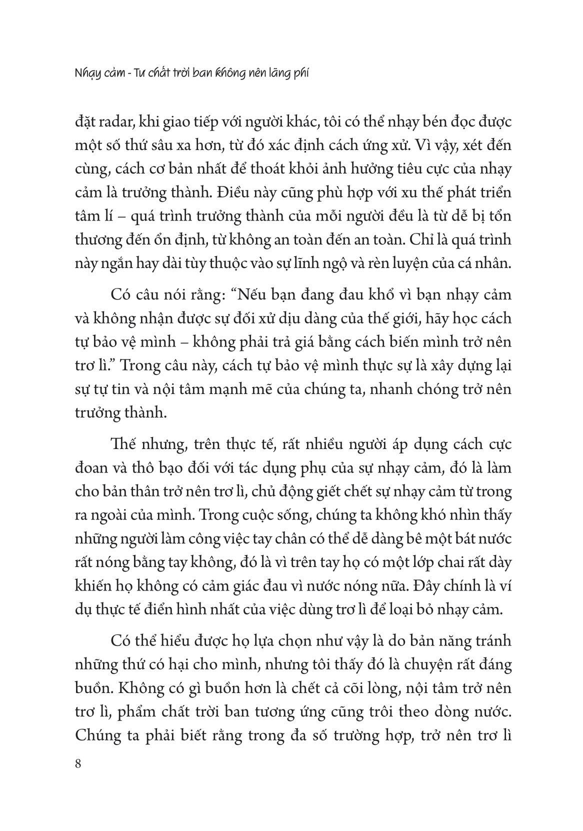 Tuy chúng ta không thể cải tạo sự nhạy cảm từ gốc rễ, nhưng chúng ta có thể sẫn dắt và hoàn thiện nó.Tính cách nhạy cảm và tính cách hướng nội giống nhau, đều có sức mạnh nội tại, đều có ưu điểm và khuyết điểm riêng của chúng, mấu chốt là chúng ta điều khiển chúng như thế nào để đạt được hiệu quả trong cuộc sống của m.ình.