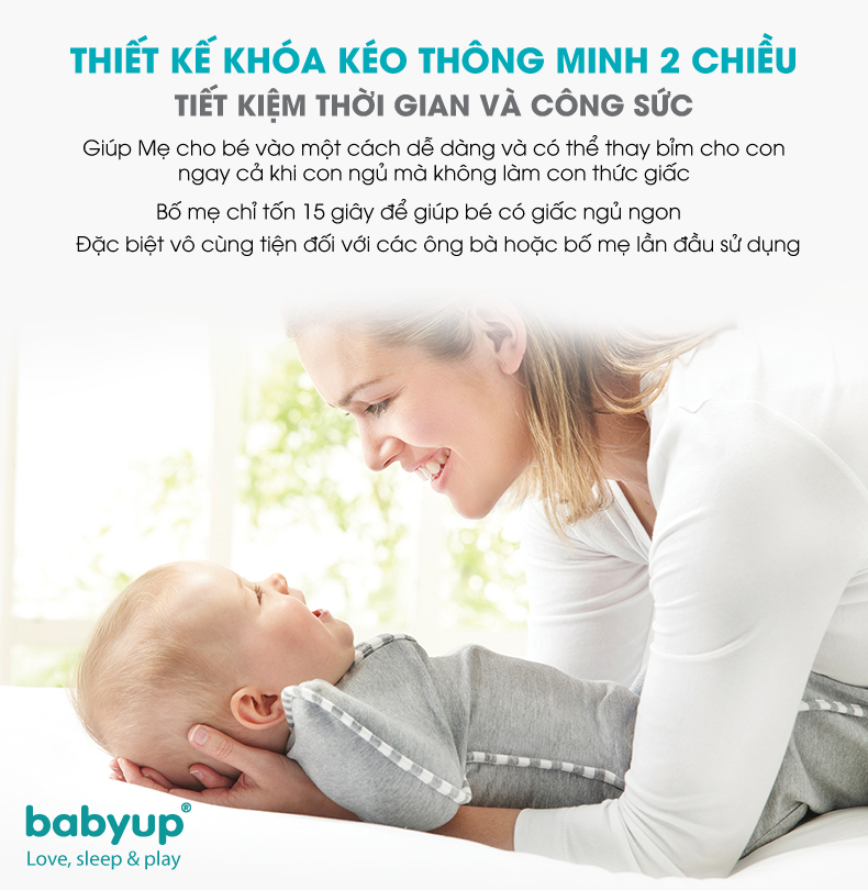 - Với khóa kéo thông mình 2 chiều giúp Mẹ cho bé vào một cách dễ dàng và có thể thay bỉm cho con ngay cả khi con ngủ mà không làm con thức giấc. Đặc biết vô cùng tiện đối với các ông bà or anh xã không biết quấn