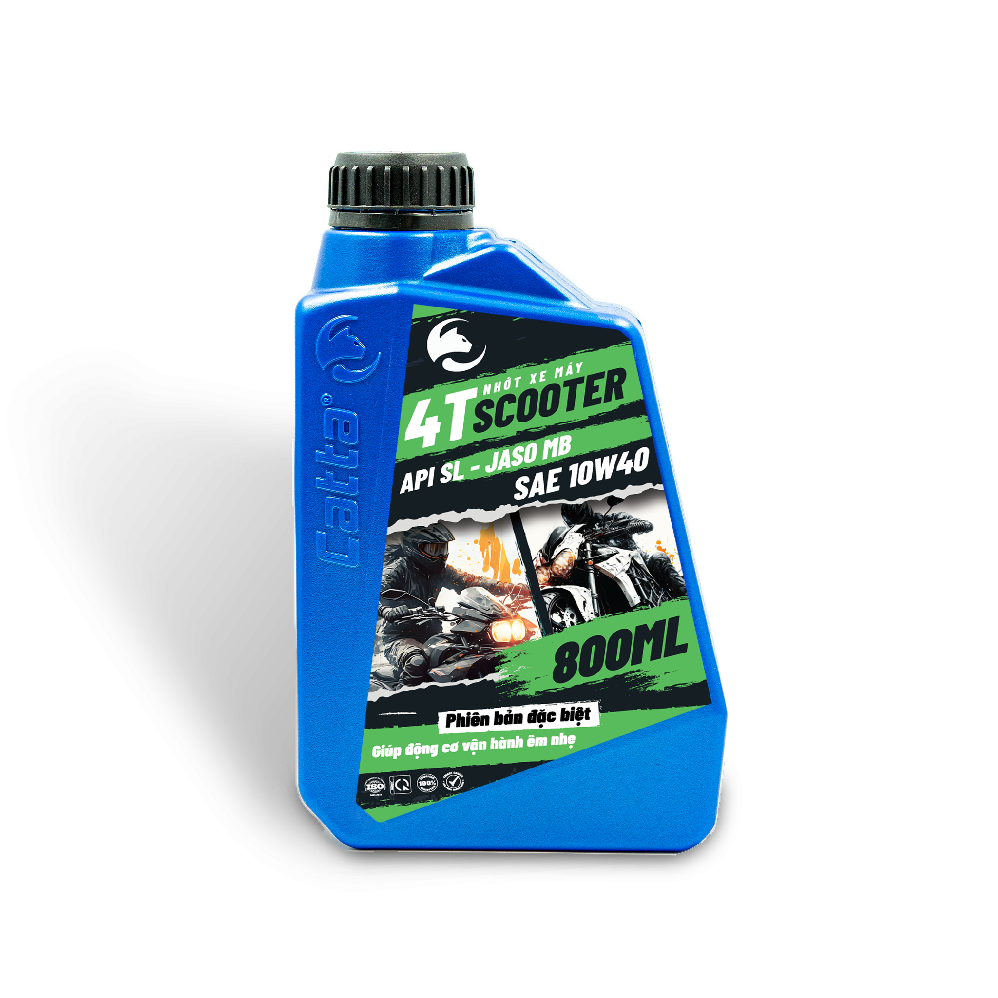 DẦU NHỚT XE XE TAY GA CATTA 4T SCOOTER SAE 10W40 – API SL – JASO MB – 24/0.8L GIỚI THIỆU Dầu nhớt xe máy CATTA 4T SCOOTER SAE 10W40, API SL, JASO MB 24/0.8L là sản phẩm dầu bôi trơn động cơ dành cho các dòng xe tay ga 4 thì. Nhớt xe máy CATTA giúp làm giảm ma sát, động cơ vận hành êm hơn và nhẹ nhàng hơn. Công thức riêng biệt kết hợp giữa dầu gốc và những phụ gia chất lượng theo một tỷ lệ hoàn hảo giúp sản phẩm dầun nhớt xe máy Catta có tính năng bôi trơn vượt trội, đồng thời bảo vệ và kéo dài tuổi thọ động cơ tối ưu. Sản phẩm dầu nhớt Catta được sản xuất từ nguyên liệu nhập khẩu hoàn toàn trên dây chuyền công nghệ hiện đại, đội ngũ kỹ thuật tận tâm và nhà máy đạt chứng nhận ISO 9001:2018. Tiêu chuẩn quốc tế đáp ứng:
