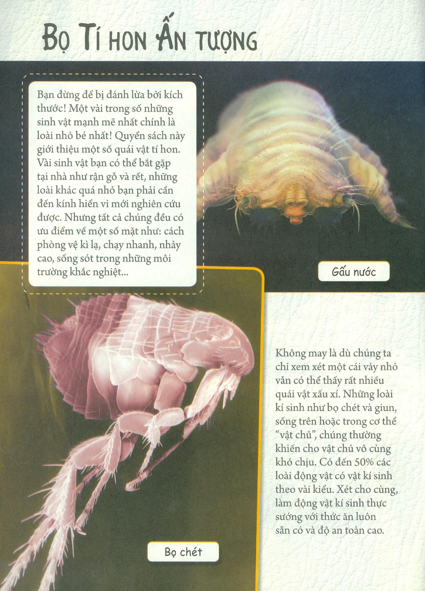 Bộ sách với cách trình bày mới mẻ, những câu chuyện ngắn thú vị giữa các loài côn trùng với nhau theo phong cách tranh truyện 4-5 khung tranh và những lời thoại độc đáo, các loài côn trùng phi thường trở nên sống động và hài hước. BỌ TÍ HON ẤN TƯỢNG giới thiệu những loài côn trùng bé tí xíu, nhưng lại có hình dáng, cấu tạo và vòng đời lạ lùng, một sức sống mạnh mẽ phi thường và môi trường sống của chúng cũng gây kinh ngạc không kém. Dường như ở những nơi không ngờ đến vẫn luôn tồn tại những siêu bọ quái đản này, bạn có biết ngay trên người thú cưng hay chính cơ thể bạn cũng có thể là nơi cư ngụ của chúng hay không?