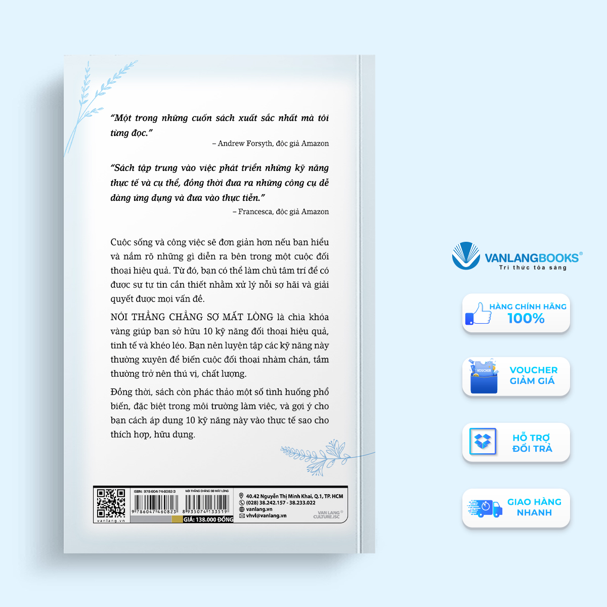 - Giới thiệu Nói Thẳng Chẳng Sợ Mất Lòng “Một trong những cuốn sách xuất sắc nhất mà tôi từng đọc.” – Andrew Forsyth, độc giả Amazon “Sách tập trung vào việc phát triển những kỹ năng thực tế và cụ thể, đồng thời đưa ra những công cụ dễ dàng ứng dụng và đưa vào thực tiễn.” – Francesca, độc giả Amazon Cuộc sống và công việc sẽ đơn giản hơn nếu bạn hiểu và nắm rõ những gì diễn ra bên trong một cuộc đối thoại hiệu quả. Từ đó, bạn có thể làm chủ tâm trí để có được sự tự tin cần thiết nhằm xử lý nỗi sợ hãi và giải quyết được mọi vấn đề. NÓI THẲNG CHẲNG SỢ MẤT LÒNG là chìa khóa vàng giúp bạn sở hữu 10 kỹ năng đối thoại hiệu quả, tinh tế và khéo léo. Bạn nên luyện tập các kỹ năng này thường xuyên để biến cuộc đối thoại nhàm chán, tầm thường trở nên thú vị, chất lượng. Đồng thời, sách còn phác thảo một số tình huống phổ biến, đặc biệt trong môi trường làm việc, và gợi ý cho bạn cách áp dụng 10 kỹ năng này vào thực tế sao cho thích hợp, hữu dụng