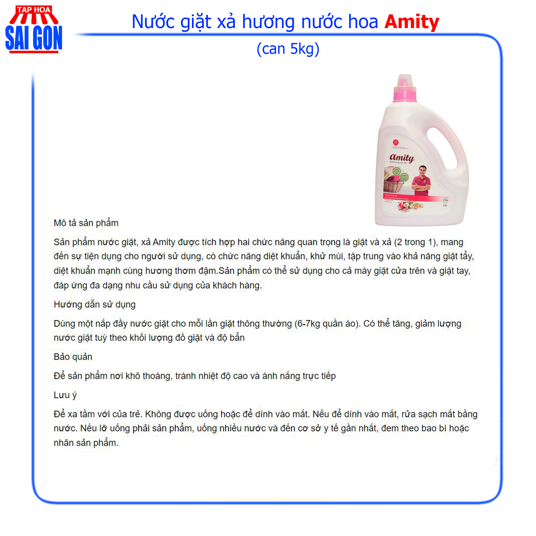 Nước Giặt Xả Amity hương nước hoa can 5kg là một Thương hiệu của Cty Nghệ sĩ MC Quyền Linh Với công nghệ tích hợp 2 chức năng giặt và xả. Nước giặt xả Amity 2 trong 1 len lỏi, thấm sâu từng sợi vải giúp cho quần áo luôn sạch khuẩn, không bay màu thơm mát cả ngày Màu hồng hương nước hoa với công nghệ lưu hương nhẹ nhàng cho quần áo suốt cả ngày. Sản phẩm được sản xuất tại Việt Nam Với công nghệ tích hợp 2 chức năng giặt và xả. Nước giặt xả Amity 2 trong 1 len lỏi, thấm sâu từng sợi vải giúp cho quần áo luôn sạch khuẩn, không để lại chất cặn trên quần áo giống như các loại bột giặt thông thường. Được áp dụng công nghệ cao với khả năng diệt khuẩn và lưu giữ hương thơm bền lâu ngay cả sau khi phơi. Sản phẩm đang được Tạp hóa Sài Gòn phân phối chính thức toàn quốc