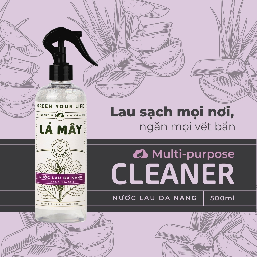 Nước Lau Đa Năng Lá Mây - Tía Tô & Nha Đam là sự kết hợp hoàn hảo giữa hai thành phần thiên nhiên dịu nhẹ, mang lại hiệu quả làm sạch vượt trội và an toàn cho mọi không gian trong nhà.