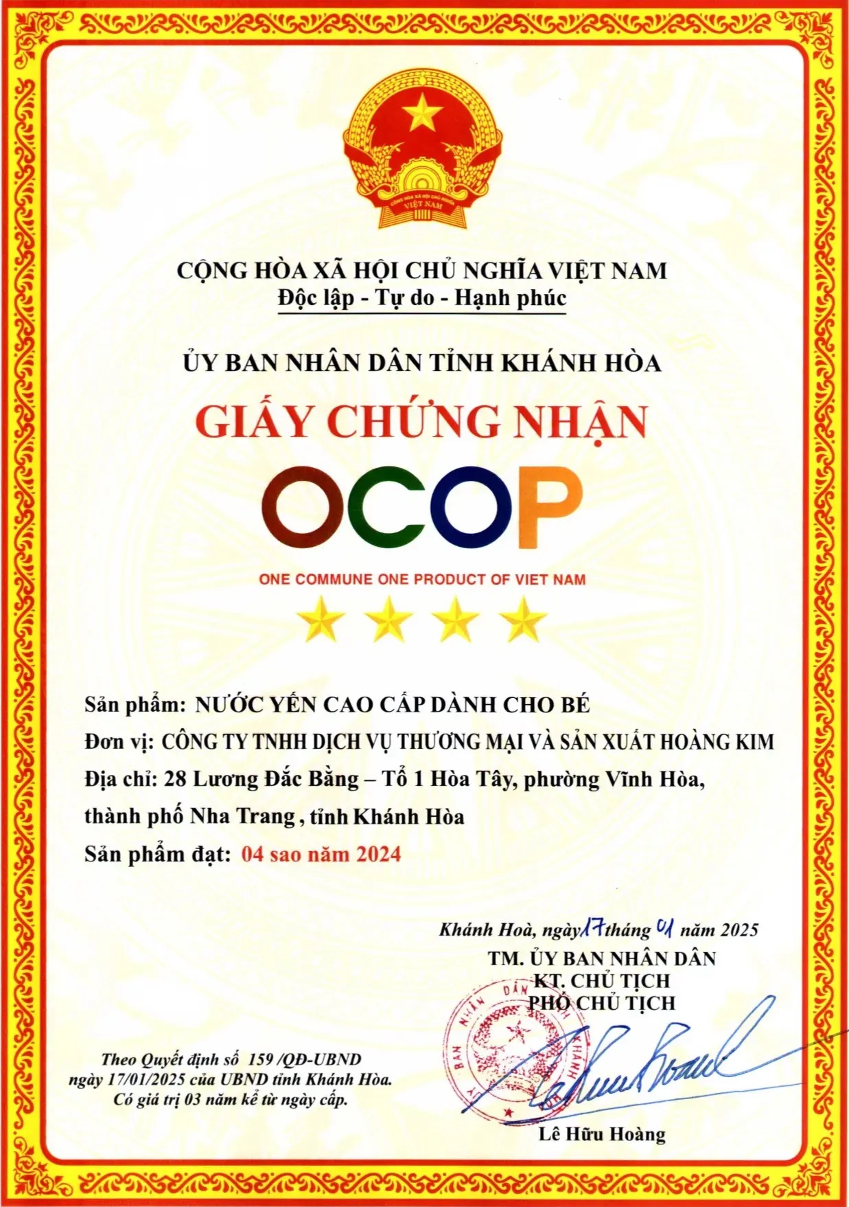 Yến Sào Hoàng Kim - Nền Tảng Vững Chắc Cho Bé Yêu Khôn Lớn, Lựa Chọn An Tâm Của Mẹ Sức khỏe của con là mối quan tâm hàng đầu của cha mẹ. Nước Yến Cao Cấp Dành Cho Bé của Yến Sào Hoàng Kim được bào chế với công thức chuyên biệt, an toàn và lành tính, nhằm mang đến nguồn dinh dưỡng tự nhiên quý giá, hỗ trợ bé phát triển toàn diện trong những năm tháng đầu đời. Điểm Vượt Trội Của Sản Phẩm: -     Công Thức An Toàn, Chuyên Biệt Cho Bé: Hàm lượng yến sào (0.5g) được nghiên cứu để phù hợp với hệ tiêu hóa và khả năng hấp thu của trẻ. Công thức không chứa gừng, có vị ngọt dịu và hương thơm lá dứa tự nhiên giúp bé uống ngon miệng. ️-     An Toàn Tuyệt Đối - Cam Kết 3 KHÔNG: Sản phẩm cam kết Không chất bảo quản, Không hương liệu nhân tạo, Không phẩm màu, đảm bảo sự tinh khiết và an toàn nhất cho sức khỏe của bé. -     Chất Lượng Được Nhà Nước Bảo Chứng (OCOP 4 Sao): Sản phẩm đạt chứng nhận OCOP 4 sao của tỉnh Khánh Hòa năm 2024. Đây là sự bảo chứng uy tín về chất lượng và nguồn gốc mà cha mẹ có thể hoàn toàn tin tưởng. -     Sản Xuất Theo Tiêu Chuẩn Quốc Tế HACCP: Quy trình sản xuất nghiêm ngặt theo chuẩn HACCP, đảm bảo vệ sinh an toàn thực phẩm ở mức cao nhất, mang lại sự an tâm tuyệt đối cho mẹ khi chọn sản phẩm cho con. Thông Tin Chi Tiết Sản Phẩm: Thương hiệu: Yến Sào Hoàng Kim Xuất xứ: Việt Nam Thành phần: Nước (68g), yến sào nguyên chất (0.5g yến khô, tương đương 4.2g yến tươi), đường phèn (6.5g), lá dứa tươi. Đối tượng sử dụng: Được thiết kế dành riêng cho trẻ nhỏ cần phát triển toàn diện. Hướng dẫn sử dụng: Lắc đều trước khi cho bé uống, ngon hơn khi uống lạnh. Là bữa phụ dinh dưỡng tuyệt vời cho bé. Hạn sử dụng: 12 tháng.