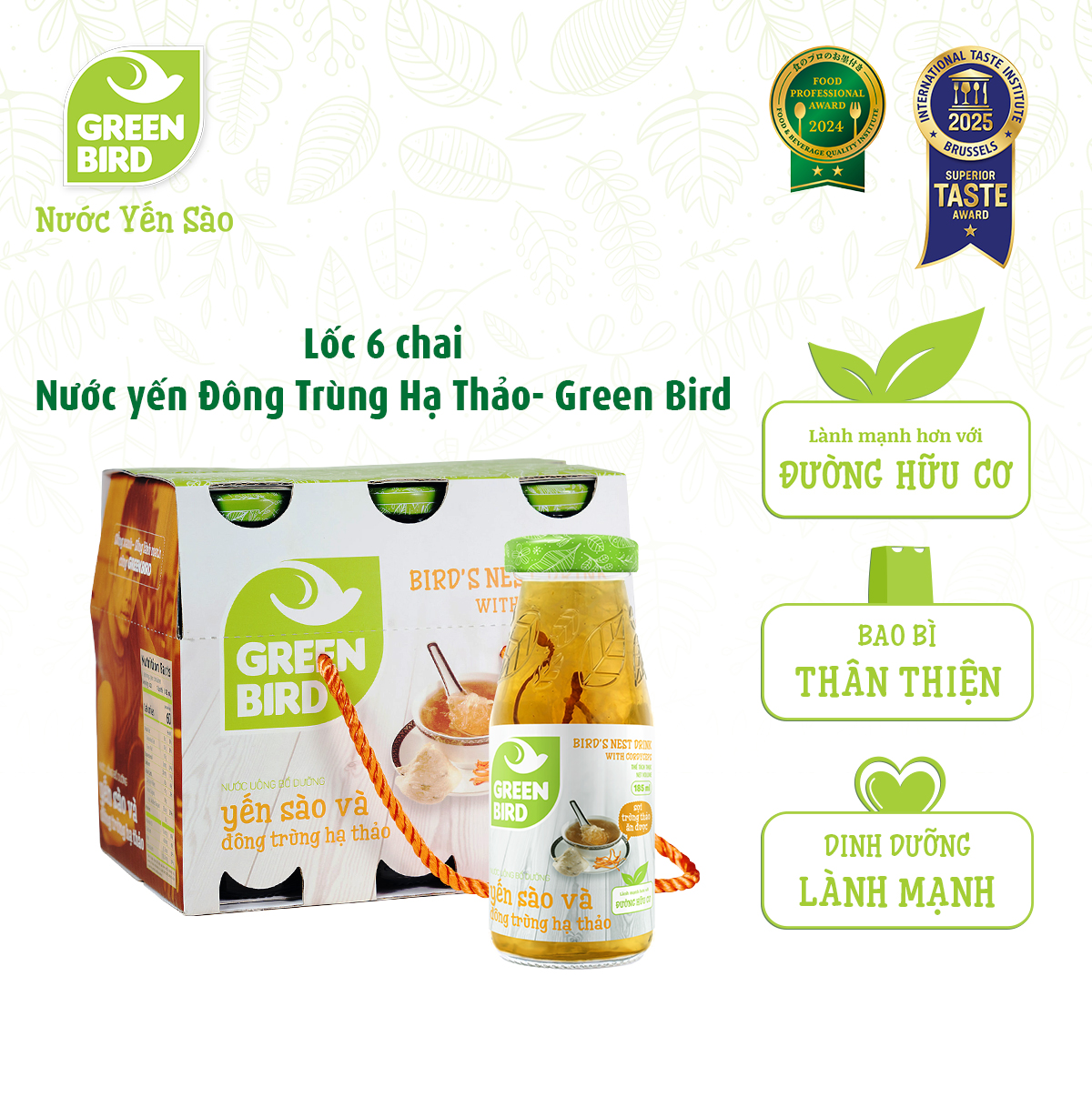 Green Bird Đông Trùng Hạ Thảo là trạm dừng nhẹ nhàng để bạn hồi phục năng lượng và tái tạo thể lực. Kết hợp tinh chất yến thật và đông trùng hạ thảo thiên nhiên, sản phẩm mang đến dưỡng chất thiết yếu cho cơ thể. Với công thức đặc biệt và hương vị thanh mát từ đường hữu cơ, sản phẩm không chỉ bổ sung năng lượng mà còn mang lại sự thư giãn cho những ngày bận rộn.   Thành phần nổi bật: Yến sào thật (50mg), đông trùng hạ thảo ngâm nở (1000mg), đường phèn vàng, đường hữu cơ, nước tinh khiết, phụ gia tự nhiên. Không chất bảo quản, không tạo ngọt tổng hợp.   Lợi ích: Hỗ trợ phục hồi thể lực, tăng sức đề kháng, giảm mệt mỏi, cải thiện giấc ngủ và cân bằng sinh lực.   Đối tượng sử dụng: Người trưởng thành, làm việc cường độ cao, cần hồi phục thể trạng.   Hướng dẫn sử dụng & bảo quản: Dùng trực tiếp, ngon hơn khi uống lạnh. Lắc đều trước khi sử dụng. Sau khi mở nắp nên dùng hết trong ngày. Bảo quản nơi khô ráo, thoáng mát, tránh ánh nắng.   Quy cách đóng gói Lốc 6 chai x 185ml. Có thể chọn phiên bản hộp quà.   Hạn sử dụng 24 tháng kể từ ngày sản xuất. NSX in trên thân hoặc nắp chai.   NutriNest là thương hiệu tiên phong trong ngành nước yến thật tại Việt Nam, sở hữu chuỗi giá trị khép kín từ trại yến đến nhà máy đạt chuẩn quốc tế USDA, ISO 22000, HACCP. Với triết lý “Nuôi dưỡng sức sống” NutriNest cam kết mang đến sản phẩm không chất bảo quản, không hóa chất độc hại, không tạo ngọt nhân tạo. Các sản phẩm NutriNest hiện được xuất khẩu chính ngạch sang Hàn Quốc, Trung Quốc, Đài Loan và đạt nhiều giải thưởng uy tín quốc tế như Superior Taste Award và Food Professional Award.
