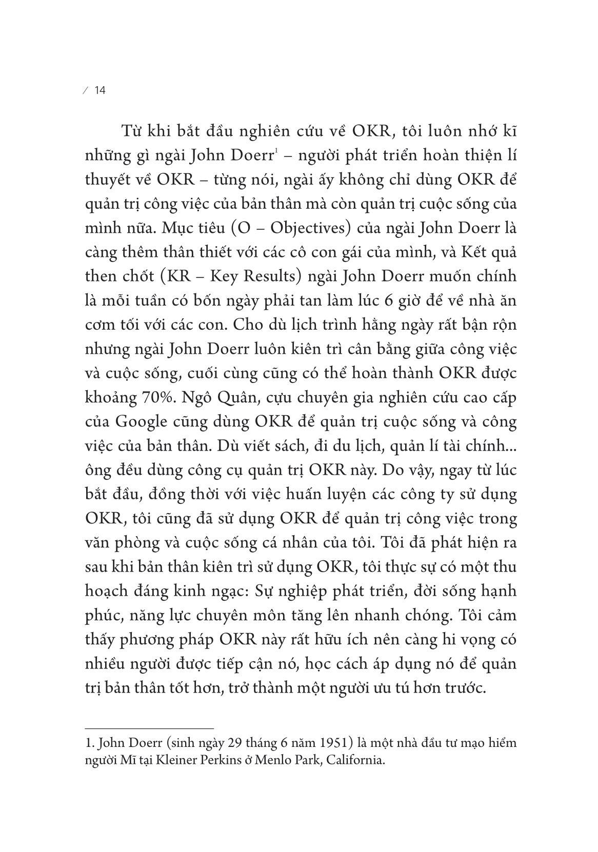 Hi vọng răng mọi người có thể dùng OKR để quản trị công việc và cuộc sống của bản thân. Tôi tin chắc bạn đọc có thể có được thu hoạch hữu ích sau khi đọc xong cuốn sách này, bởi vì OKR chính là phương pháp quản trị cuộc đời tuyệt diệu nhất.