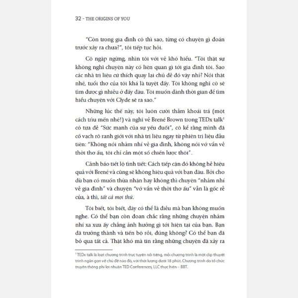 Như tác giả đã chỉ ra: “Khi còn bé, hẳn bạn đã nghe vô số lời khuyên hoặc khuyến khích rằng nên làm điều này thêm một chút, điều kia ít đi một chút để nhận được sự yêu thương, kết nối, công nhận, an toàn hoặc khẳng định từ cha mẹ hay người chăm sóc. Bạn có thể nhận được những lời nhắn nhủ từ cha mẹ, những thông điệp mà họ tưởng là vô hại, nhưng thật ra lại khiến bạn không còn là mình nữa… Bạn hẳn đã làm theo ý mọi người… Vì bạn được lập trình để tìm kiếm sự gắn bó. Vì gắn bó là điều cần thiết cho sự sinh tồn của bạn… Nhưng sự chân thật cũng cần thiết không kém gì nhu cầu gắn bó.