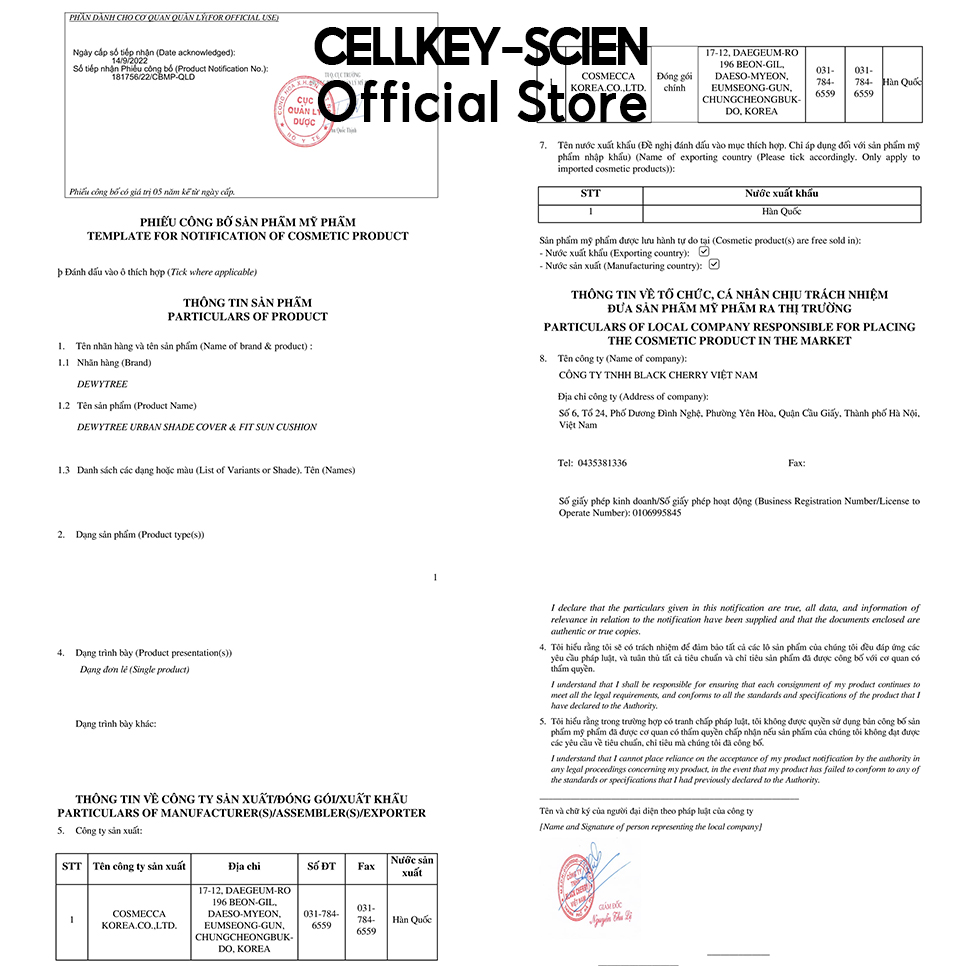 Xuất xứ sản phẩm: Hàn Quốc (Made in Korea). Sản phẩm đã được cấp giấy phép chứng nhận tiêu chuẩn chất lượng ở 2 quốc gia Hàn Quốc – Việt Nam. Tone #10 dành cho