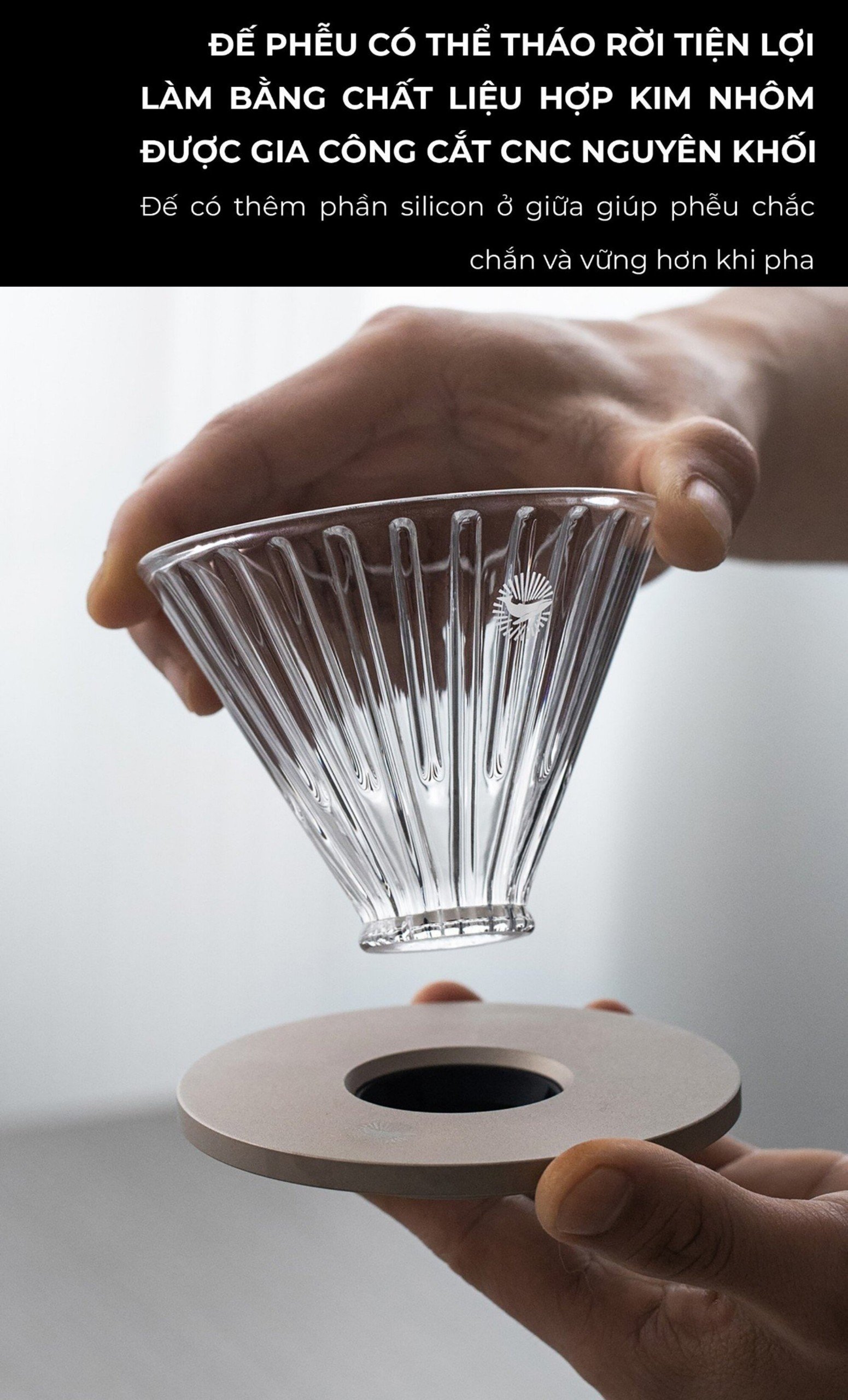 ✨Phễu thuỷ tinh V60 rãnh thẳng đế nhôm Cafede Kona