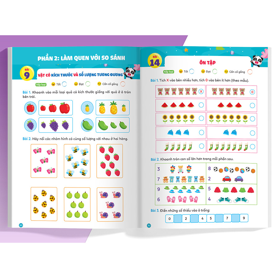 - Phiếu luyện toán tư duy cùng Kiki (Quyển 1, quyển 2, quyển 3, quyển 4, quyển 5) Ưu điểm của cuốn Phiếu luyện toán tư duy cùng Gấu KiKi 4. Tách gộp nhóm số lượng - Làm quen với so sánh: Bé được học cách tách - gộp nhóm số lượng trong phạm vi 3 – 5 - 10 Bé được làm quen với so sánh: vật có kích thước và số lượng tương đương, số lượng bằng nhau, so sánh hơn – kém, nhiều hơn – ít hơn, thêm hoặc bớt, Cuốn sách được thiết kế với màu sắc bắt mắt, đẹp, giúp các bé có hứng thú học hơnọ Hình ảnh minh họa sinh động, nhiều màu sắc kích thích sự sáng tạo và hứng khởi vào bài học của bé. Sau mỗi bài học là bài tập ôn tập giúp bé ôn lại kiến thức, ghi nhớ lâu và sâu hơn. Hãy để con chuẩn bị kiến thức toàn diện nhất để con tự tin bước vào lớp 1 cùng bộ sách Học cùng gấu Kiki!
