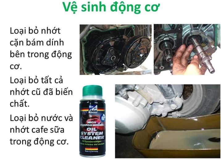 Giới thiệu Phụ gia nhớt vệ sinh động cơ xe máy Bluechem 33017 Phụ gia nhớt vệ sinh động cơ xe máy Bluechem 33017 giúp loại bỏ nhớt cũ, cặn bã lâu ngày bám dính trong động cơ hổ trợ động cơ tăng hiệu quả hoạt động cũng như khả năng kéo dài tuổi thọ cho động cơ. Phụ gia nhớt vệ sinh động cơ xe máy Bluechem 33017 được cấp chứng nhận TUV về an toàn và hiệu quả và Công nghệ duy nhất trên thế giới hiện nay kết hợp làm sạch và bảo vệ một cách toàn diện nhất. Thông tin chi tiết