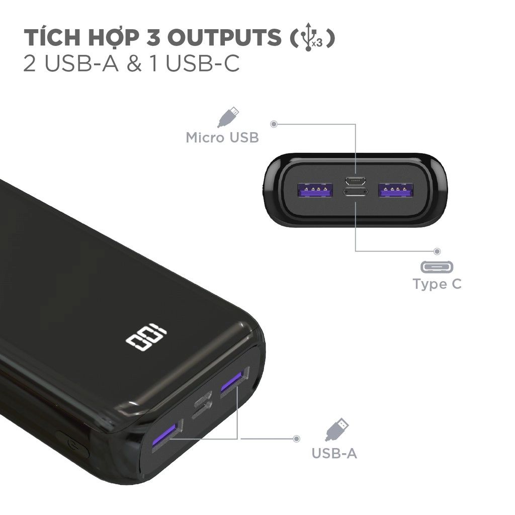 Tính năng Dung lượng 10.000mAh tương ứng 37Wh cung cấp đến nhiều giờ sử dụng cho các thiết bị điện tử 3 cổng sạc ra gồm 1 USB-A và 2 USB-C, thoải mái sạc 3