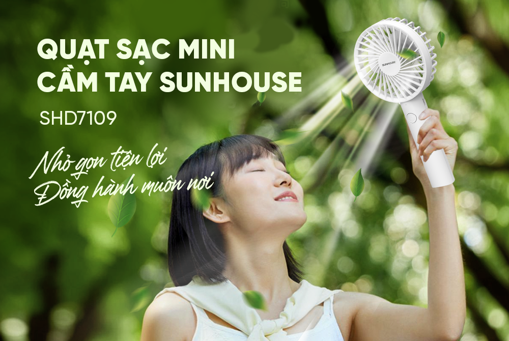 Quạt sạc mini cầm tay SUNHOUSE SHD7109 có thiết kế nhỏ gọn, thời trang, sở hữu pin sạc Lithium chất lượng cao giúp quạt có thể hoạt động liên tục trong thời gian từ 5 giờ