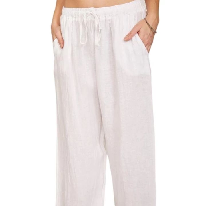 THÔNG TIN SẢN PHẨM: - Sản phẩm: Quần dài nữ - Chất liệu: Linen - Đặc điểm: Ống rộng, Đũng ngắn, Lưng thun - Kích thước: M, L, XL, 2XL - Màu sắc: Trắng,Đen,Be,Muối