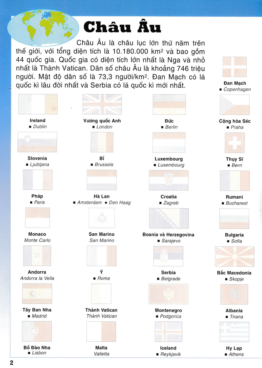 Mỗi châu lục sẽ bao gồm một phần giới thiệu ngắn gọn những thông tin địa lý ở ngay đầu sách, các lá cờ kèm tên quốc gia và thủ đô (hoặc thành phố lớn) thuộc châu lục đó và bản đồ toàn bộ khu vực của nó. Đặc biệt ở cuối sách, bạn đọc sẽ còn được làm quen với lá cờ của những tổ chức/hiệp hội lớn trên thế giới, được tương tác thông qua hoạt động thiết kế và tô màu lá cờ.