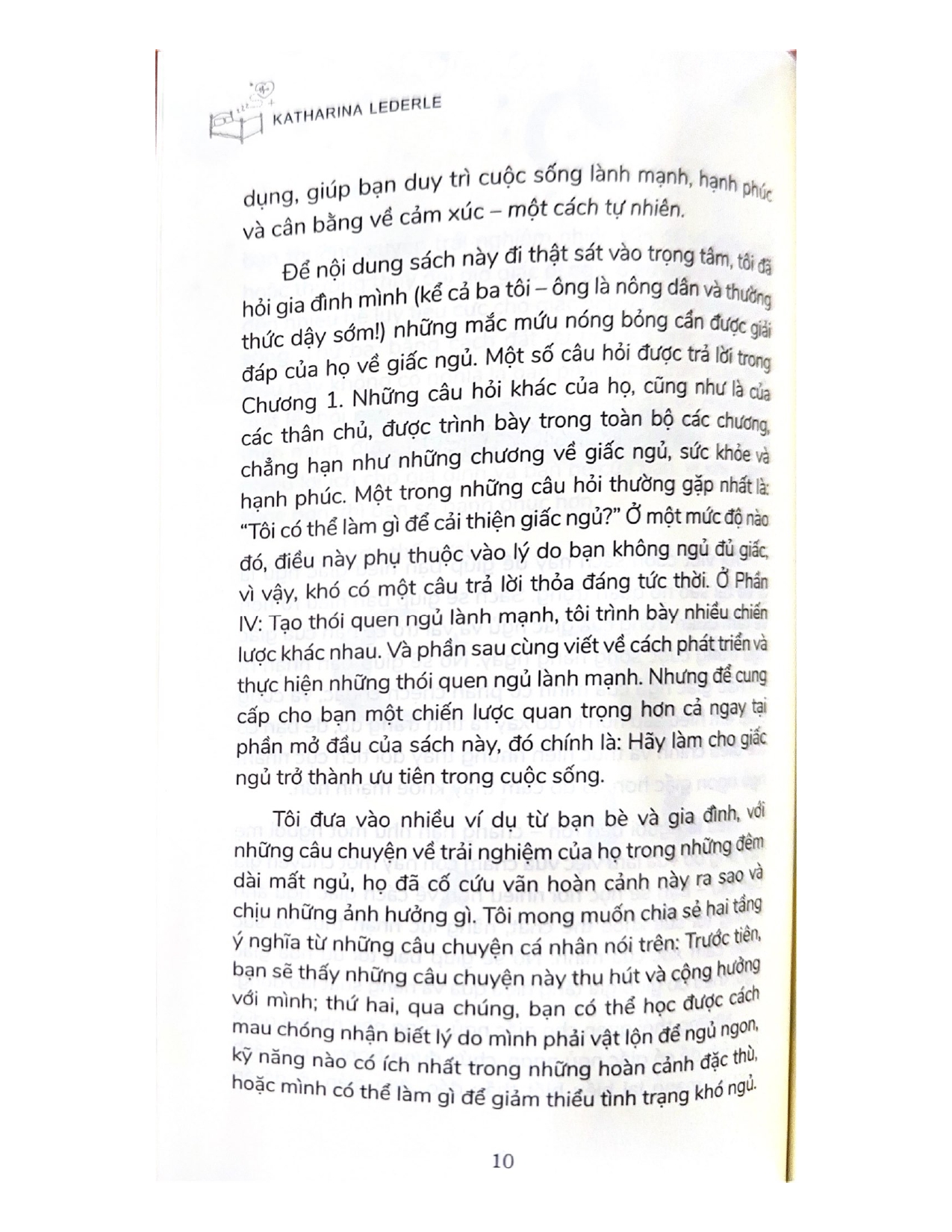 - Giới thiệu Quyền Năng Vô Hạn Của Giấc Ngủ Có lòng can đảm đối với những nỗi buồn lớn của cuộc sống và kiên nhẫn đối với những điều nhỏ nhặt và khi bạn đã hoàn thành công việc hàng ngày của mình một cách chăm chỉ, hãy đi ngủ trong yên bình. Victor Hugo Một cuốn sách rất thú vị! Từ quá trình nghiên cứu và kinh nghiệm làm việc, Katharina Lederle đã giải thích những kiến thức khoa học mới nhất về giấc ngủ, cũng như lý do tại sao giấc ngủ ngon lại quan trọng đối với sức khỏe và niềm hạnh phúc của chúng ta. Cách tiếp cận thực tế đầy thu hút này giúp việc đặt ưu tiên lên giấc ngủ và làm theo lời khuyên của bà trở nên dễ dàng – chúng là sự kết hợp giữa khoa học và thường thức. Tôi khuyên các bạn nên đọc nó!