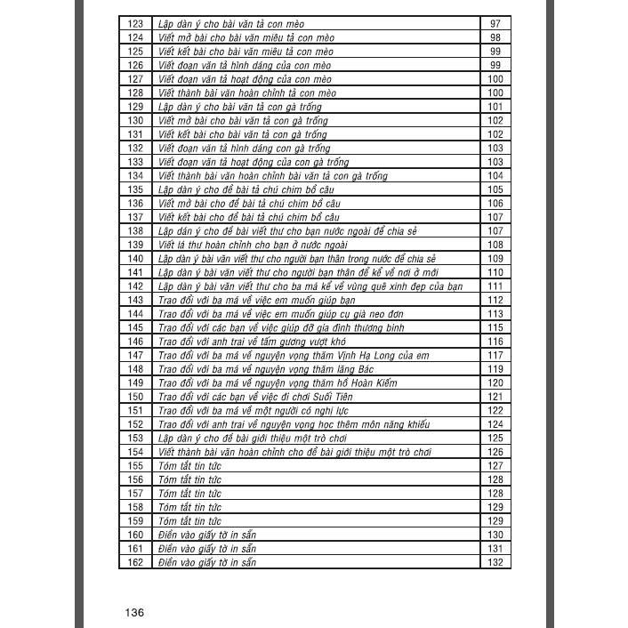 SÁCH - 162 bài tập làm văn chọn lọc 4 (dùng chung cho các bộ sgk hiện hành) Môn văn đối với các em học sinh luôn là một bộ môn khá "khó nuốt" vì thật sự để có thể viết được một bài văn hay đòi hỏi các em có một vốn từ vựng phong phú và khả năng sử dụng, kết hợp nhuần nhuyễn ngữ pháp. Vì vậy, để giúp các em cải thiện được kĩ năng làm tập làm văn, xin giới thiệu đến quý phụ huynh và các em cuốn 162 Bài Tập Làm Văn Chọn Lọc 4.Với 162 bài tập làm văn được chọn lọc và sưu tầm dựa theo chương trình dành cho học sinh lớp 4, các em sẽ dễ dàng tìm đọc được những bài văn hay, tham khảo được cách viết và kĩ năng dùng từ cũng như cách phân tích đề để làm một bài văn. Bên cạnh những đề văn quen thuộc mà các em đã được làm trên lớp, 162 Bài Tập Làm Văn Chọn Lọc 4 còn bổ sung rất nhiều những đề văn lạ và hay nhằm giúp các em mở rộng được ý tưởng cũng như có cơ hội cọ xát được với nhiều cách ra đề khác nhau, làm tài liệu tham khảo trong quá trình học cũng như khi thi cử.