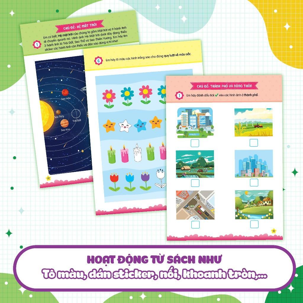 Ngoài ra, bộ sách còn có các Stickers, những phần tô màu, tạo cho con các hoạt động phong phú thông qua những hình ảnh và màu sắc trực quan sinh động