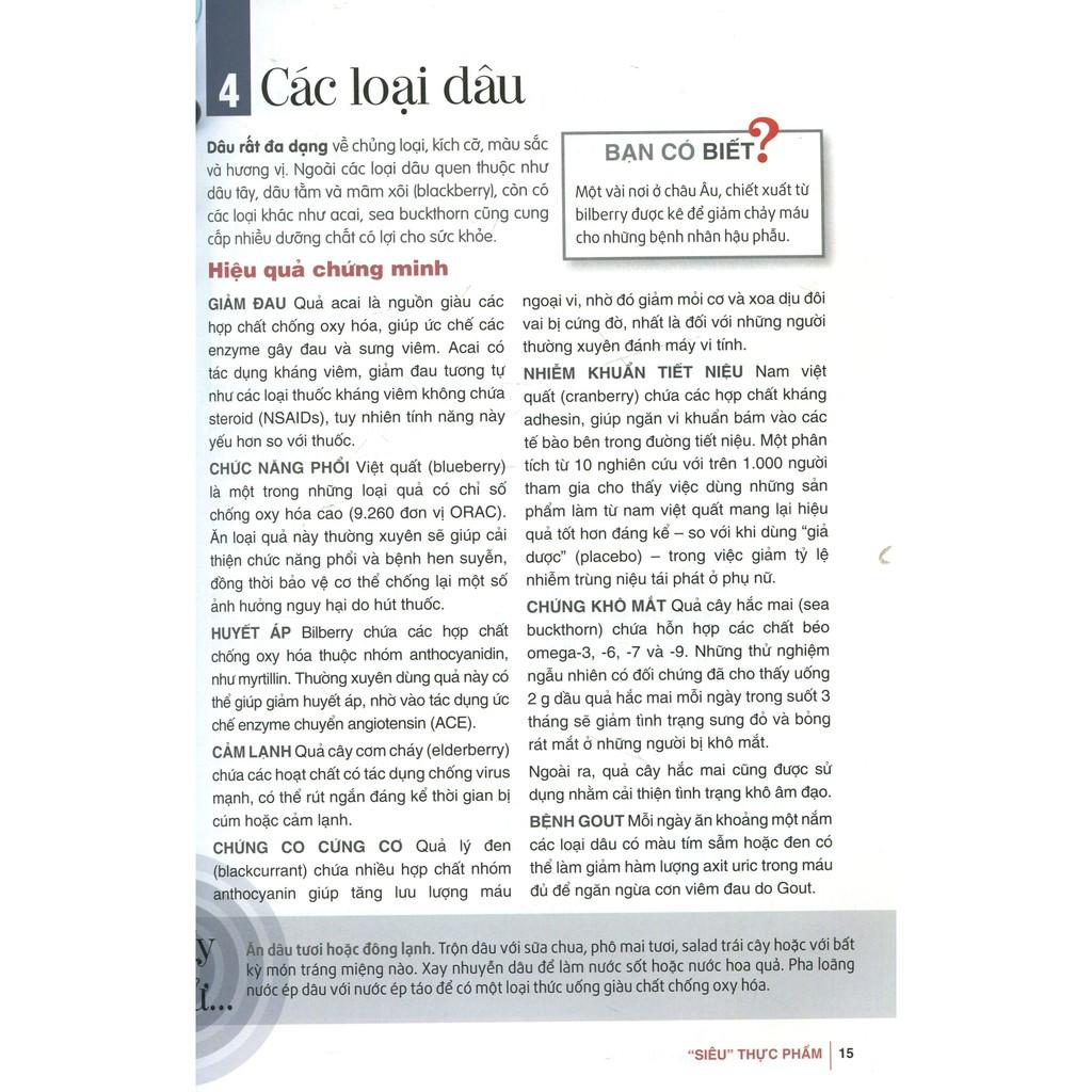 Thuật ngữ “siêu thực phẩm” ngày càng được sử dụng rộng rãi, dù có phần cường điệu nhưng không thể phủ nhận những đặc tính vượt trội của chúng. Phần 1 của sách sẽ giới thiệu tổng quan về những loại thực phẩm này, cùng với những nghiên cứu khoa học mới nhất lý giải vì sao chúng được xem là “siêu thực phẩm”. Những hợp chất “thần diệu” này có thể tăng thêm “sức chiến đấu” cho cơ thể, giúp đẩy lùi bệnh tật. Phần 2 sẽ đề cập đến 50 bệnh phổ biến – từ hen suyễn, đau nửa đầu đến tim mạch, viêm thấp khớp – đồng thời nêu rõ loại thực phẩm nào có lợi cho sức khỏe và thực phẩm nào cần tránh. Bên cạnh đó, một số món ăn dinh dưỡng và không kém phần ngon miệng cũng được giới thiệu; có cả những mẹo hay về dinh dưỡng, những lời khuyên hữu ích khi sử dụng các chế phẩm bổ sung.