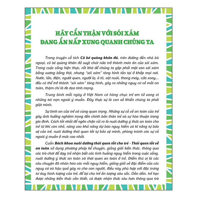 Sách: Bách Khoa Nuôi Dưỡng Thói Quen Tốt Cho Trẻ - Thói Quen Tốt Về An Toàn Trong truyện cổ tích Cô bé quàng khăn đỏ, trên đường đến nhà bà ngoại, cô bé quàng khăn đỏ suýt chút nữa trở thành món ăn của sói xám. Trong cuộc sống hiện thực, rất khó để chúng ta gặp phải một con sói xám bằng xương bằng thịt, nhưng “sói xám” tàng hình tồn tại ở khắp mọi nơi. Nước, lửa, điện, người quen, người lạ, ô tô, vật nuôi, thang máy, cửa đều có thể trở thành “sói xám” tàng hình, gây ra những nguy cơ về mất an toàn, thậm chí là đe dọa tính mạng. Trung bình mỗi ngày ở Việt Nam có hàng chục trẻ em tử vong vì những tai nạn ngoài ý muốn. Đây thực sự là con số khiến chúng ta phải giật mình. Sự bình an của trẻ vô cùng quan trọng. Những sự cố về an toàn của trẻ gây ảnh hưởng nghiêm trọng đến chính bản thân trẻ và sự hòa thuận trong gia đình. Cách tốt nhất để ngăn chặn rủi ro là nuôi dưỡng ý thức an toàn cho trẻ từ khi còn nhỏ, nâng cao khả năng dự báo nguy hiểm và kĩ năng tự bảo vệ của trẻ, nuôi dưỡng thói quen tốt tự bảo vệ mình, phòng tránh các sự cố ngoài ý muốn ở mức cao nhất. Cuốn Bách khoa nuôi dưỡng thói quen tốt cho trẻ - Thói quen tốt về an toàn sử dụng phương pháp kể chuyện, giảng giải kiến thức, thông qua các trò chơi để dạy trẻ nhận biết các tình huống nguy hiểm trong cuộc sống, nuôi dưỡng ý thức an toàn và thói quen an toàn ở trẻ. Điểm thú vị là các câu chuyện đã nhân hóa các mối nguy hiểm, giảng giải về đặc điểm của các nguy cơ và hậu quả gây ra cho con người, điều này phù hợp với đặc trưng tư duy hình tượng của trẻ, để lại cho trẻ ấn tượng sâu sắc. Dần dần, trẻ học được những kiến thức cần thiết, có được nhận thức sâu hơn thông qua trò chơi, từ đó nuôi dưỡng thói quen tốt. Đây thực sự là cuốn bách khoa giáo dục an toàn cho trẻ có nội dung mới mẻ, thực tế và hấp dẫn. Sự bất cẩn của người lớn cũng có thể mang đến cho trẻ những nguy hiểm tiềm tàng. Ví dụ, một người cha dẫn con trai ba tuổi đi công viên chơi rồi nói với con: “Bi ơi, bố ngồi đây học ngoại ngữ, con chạy bộ nhé, chạy xong một vòng về báo cáo bố một lần.” Cậu bé nói: “Vâng ạ.” Con chạy một vòng rồi quay lại: “Bố ơi, con quay lại rồi.” Người cha nói: “Tốt lắm, chạy thêm vòng nữa.” Cậu lại chạy thêm vòng nữa, lại báo cáo: “Bố, con quay lại rồi.” Người cha nói: “Tốt lắm, con chạy vòng nữa nhé.” Người cha mải học từ mới, không để tâm chăm sóc con, cuối cùng không thấy con đâu. Cậu bé chạy vòng thứ ba mà mãi không quay lại. Đến lúc đó người cha mới giật mình nhận ra, có khi con đi lạc rồi. Trời tối, công viên thì rộng, làm thế nào bây giờ? Người cha vội vàng thông báo nhờ người đi tìm giúp mà trong lòng như lửa đốt. Cuối cùng phát hiện ra con vừa khóc vừa đi về nhà. Thật may mắn làm sao! Có thể thấy, sự lơ là của cha mẹ còn đáng sợ hơn những nguy hiểm tiềm tàng, nguy hiểm tiềm tàng + lơ là = tai nạn. Ứng phó với tai nạn là giải pháp nhất thời, dự phòng nguy hiểm mới là giải pháp lâu dài. Chúc cho các bậc cha mẹ cùng con trẻ của mình có thể nhận biết được rủi ro, dự phòng nguy hiểm, sống một đời bình an.