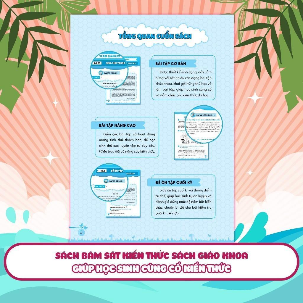 - Bài tập nâng cao: Phần này sẽ cung cấp 1 số các bài tập và hoạt động mang tính thử thách hơn, để các em thử sức, luyện tập tư duy sâu từ đó trau dồi và nâng cao kiến thức. Cuốn sách cũng cung cấp 5 đề ôn tập cuối kì với thang điểm cụ thể, để các em tự ôn luyện và đánh giá đúng mức độ nắm kiến thức, chuẩn bị tốt kiến thức và tâm lý cho bài kiểm tra cuối kì.