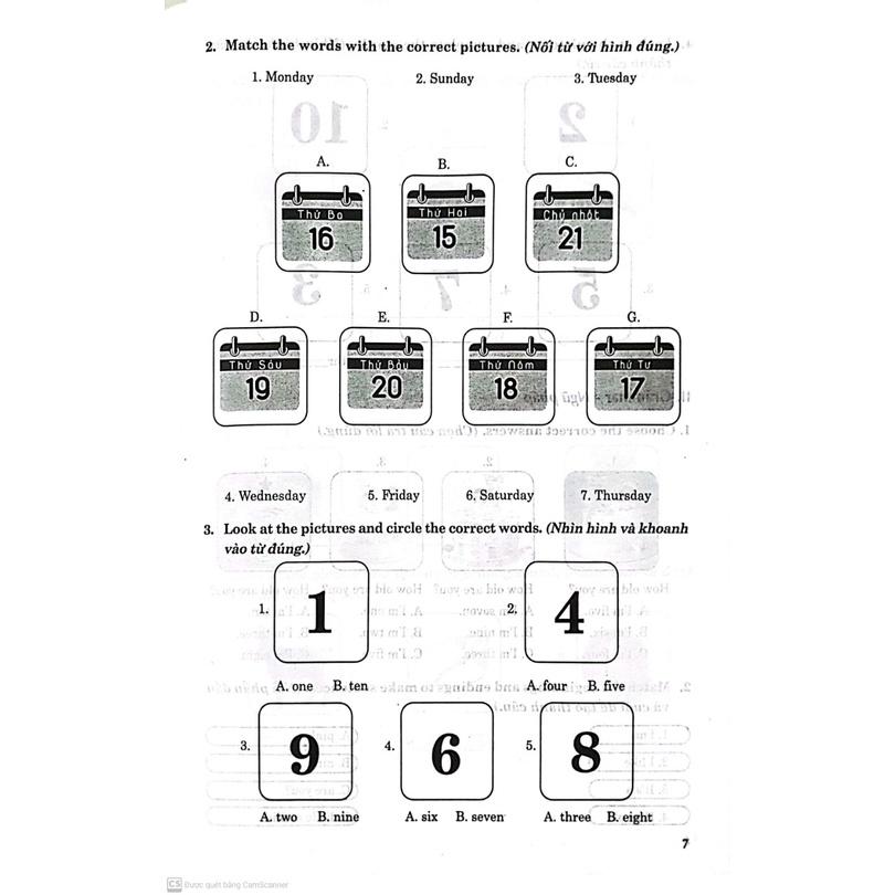 thông qua các hoạt động đa dạng trong phần Bài tập, chẳng hạn như nối từ với hình đúng, nhìn hình và đánh dấu chọn vào ô đúng, tô và viết các số,
