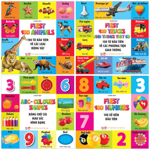 Bộ Sách 100 Từ Đầu Tiên Cho Bé (Bộ 4 Cuốn) Bộ sách 100 Từ Đầu Tiên Cho Bé là sách song ngữ dành cho trẻ nhỏ, giúp bé làm quen với những từ vựng cơ bản trong cuộc sống. Nội dung gồm các từ thuộc nhiều chủ đề như động vật, đồ vật, màu sắc, số đếm, hình dạng… Mỗi từ đều đi kèm hình minh họa sinh động, giúp bé dễ nhận biết và ghi nhớ. Phiên âm và nghĩa tiếng Việt giúp trẻ tiếp cận tiếng Anh một cách tự nhiên. Sách được thiết kế với màu sắc tươi sáng, chất liệu bìa cứng bền đẹp, phù hợp cho bé từ 0-3 tuổi. Đây là lựa chọn lý tưởng giúp bé phát triển vốn từ ngay từ nhỏ