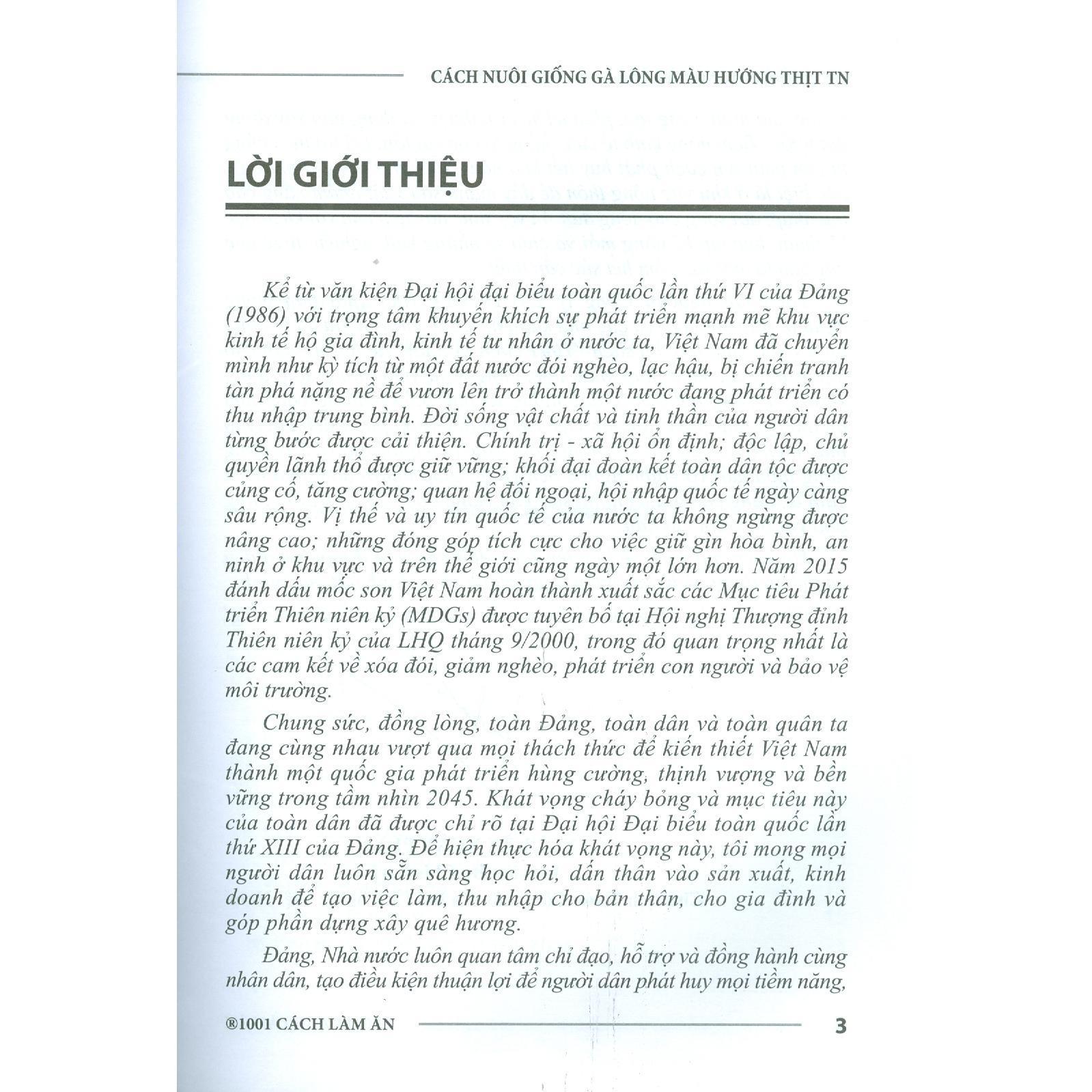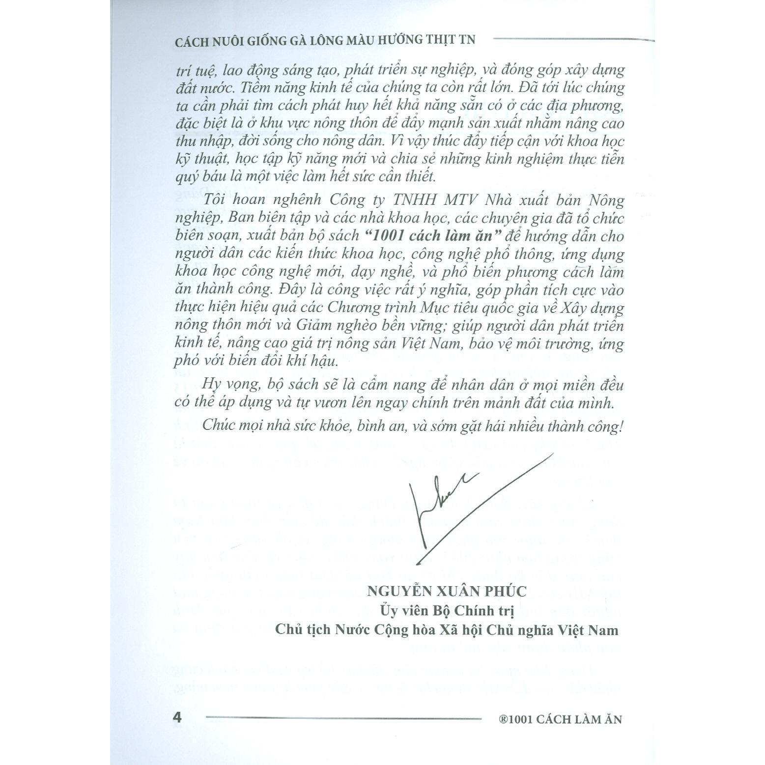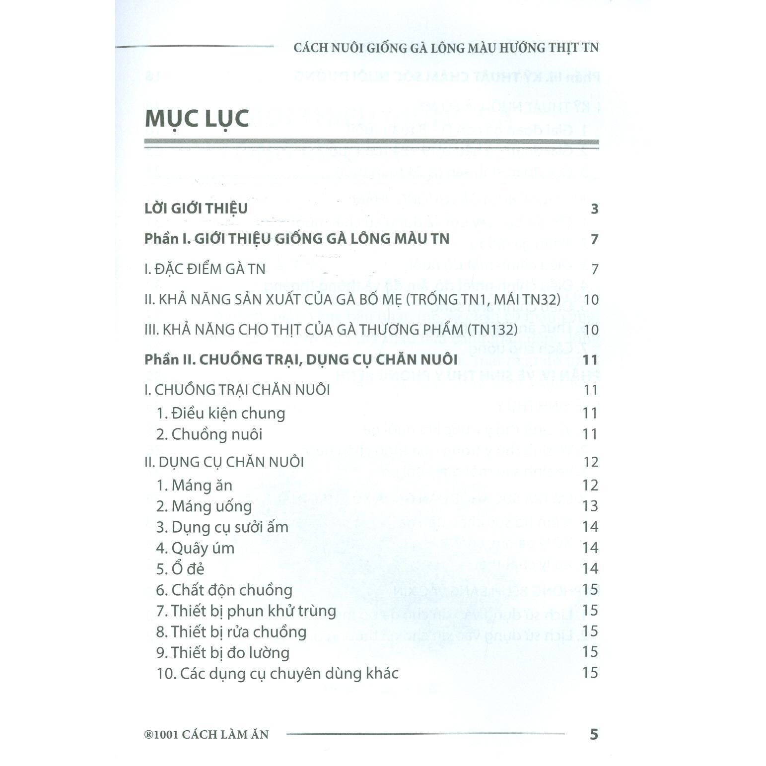 Công ty TNHH MTV Nhà xuất bản Nông nghiệp, Ban biên tập và các nhà khoa học, các chuyên gia đã tổ chức biên soạn, xuất bản bộ sách "1001 cách làm ăn" để hướng dẫn cho người dân các kiến thức khoa học, công nghệ phổ thông, ứng dụng khoa học công nghệ mới, dạy nghề, và phổ biến các cách làm ăn thành công. Cuốn sách "Cách Nuôi Giống Gà Lông Màu Hướng Thịt TN" gồm 4 phần;