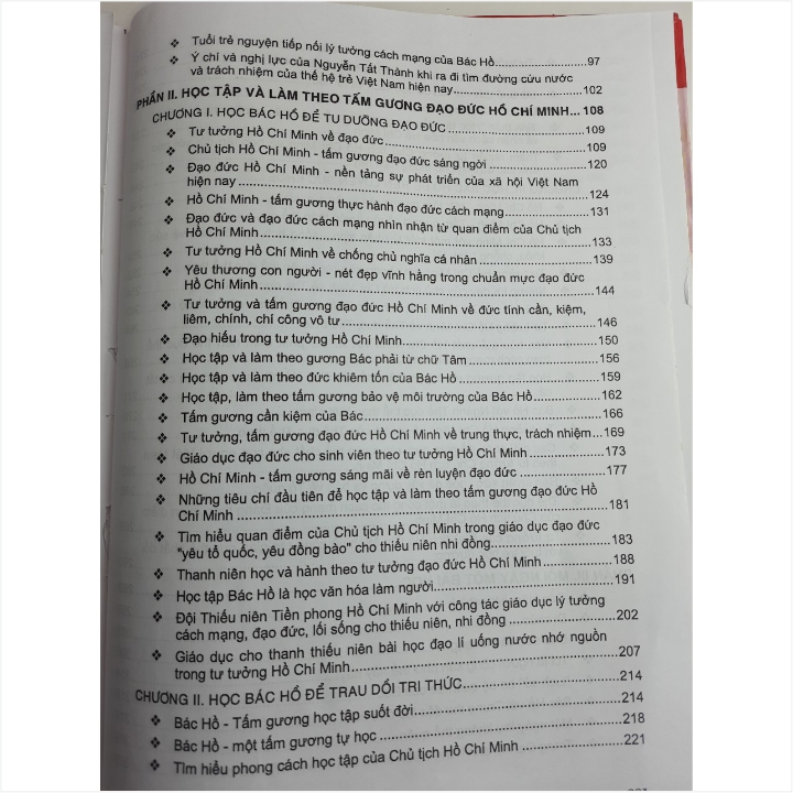 - Phần thứ ba. Mỗi ngày một bài học: Những bài học về tấm gương đạo đức Hồ Chí Minh giản dị mà vĩ đại qua cuộc đời hoạt động cách mạng cũng như cuộc sống đời thường của Người. Nội dung cuốn sách giúp học sinh sinh viên và cán bộ giảng dạy có điều kiện tìm hiểu một cách đầy đủ, toàn diện về cuộc đời và sự nghiệp Hồ Chí Minh, tư tưởng đạo đức của Người nói riêng cũng như tăng hiệu quả trong việc học tập và làm theo tấm gương đạo đức Hồ Chí Minh .../... Cảm ơn các bạn đã ghé thăm shop Nhà sách Nam Việt rất nhiều ạ! Cẩm Nang Học Tập Và Làm Theo Tấm Gương Đạo Đức Hồ Chí Minh Dành Cho Học Sinh, Sinh Viên Cẩm Nang Học Tập Và Làm Theo Tấm Gương Đạo Đức Hồ Chí Minh Dành Cho Học Sinh, Sinh Viên