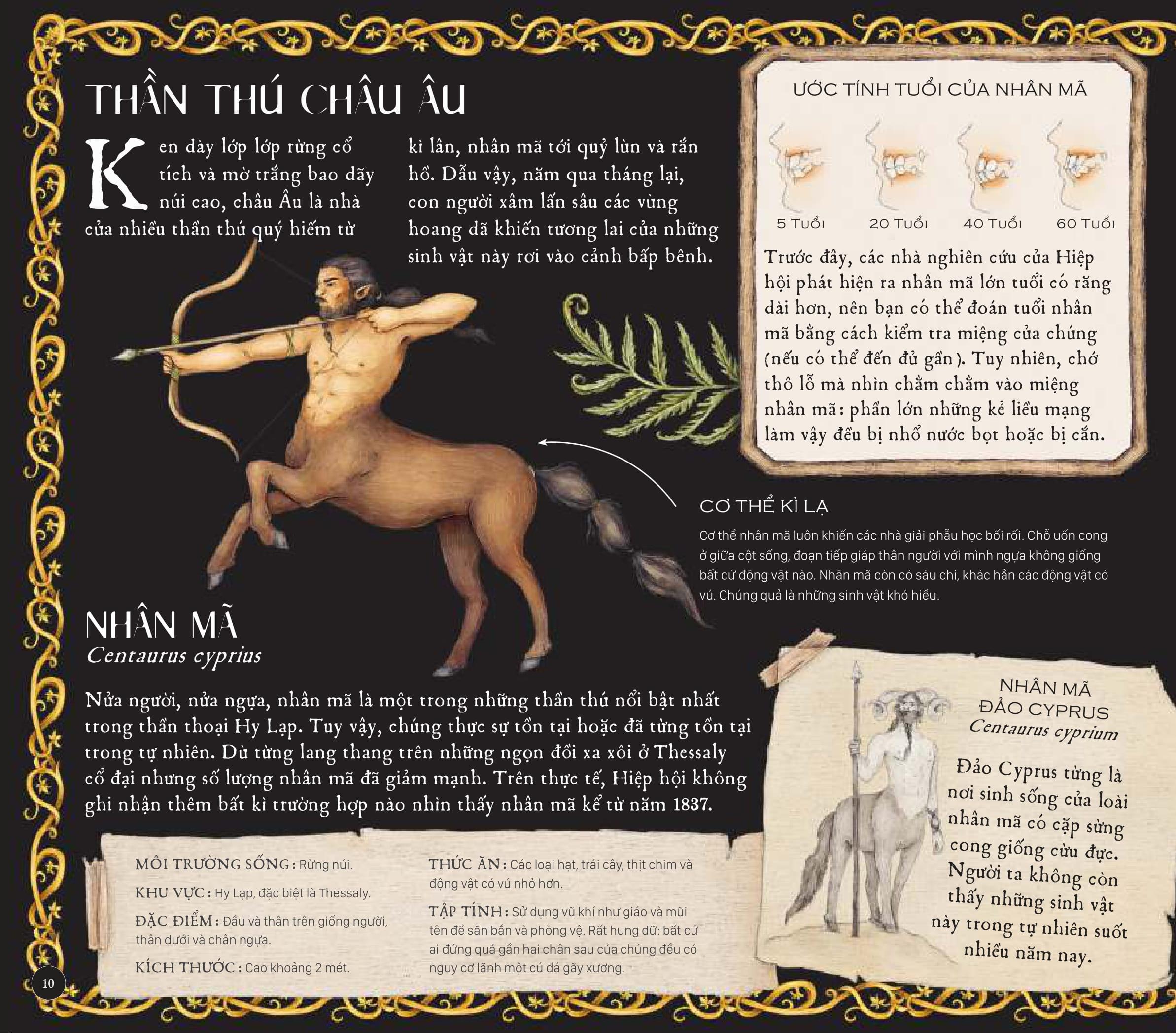 Cẩm Nang Về Sinh Vật Huyền Bí Bạn đọc thân mến, Bạn đã sẵn sàng cho chuyến hành trình có một không hai chưa? Vậy hãy lật giở cuốn sách này ngay thôi nào! Truyền kì về các loài sinh vật huyền bí đã được kể xuyên suốt nhiều thế hệ, ở khắp mọi nơi trên thế giới. Liệu những câu chuyện này chỉ là sản phẩm của trí tưởng tượng, hay bao điều chúng ta nghe về các loài rồng, nhân mã và điểu sư đều là sự thật? Biên soạn từ sổ tay của một nhà động vật học những năm 1920, cuốn sách sẽ trả lời câu hỏi trên thông qua việc hé lộ thế giới bí ẩn của muôn loài sinh vật huyền bí đã và đang sống giữa chúng ta. Lật giở từng trang sách, bạn sẽ không khỏi ngỡ ngàng, choáng ngợp trước những sinh vật tuyệt đẹp khắp đ.ịa cầu, khám phá đặc điểm, tập tính và huyền thoại lôi cuốn, kịch tính xung quanh chúng. Cảm giác còn trên cả phấn khích khi được hiểu thêm về chiếc sừng phép thuật của kì lân, vòng đời của phượng hoàng, vũ điệu ghép đôi của mãng xà và nhiều những chỉ dẫn siêu thiết thực về cách tiếp cận, tìm kiếm các sinh vật này. Nếu bạn tin vào thế giới huyền ảo và khao khát tự m.ình tìm gặp một trong các sinh vật huyền bí, cuốn sách này sẽ là điểm khởi đầu hoàn hảo dành cho bạn.