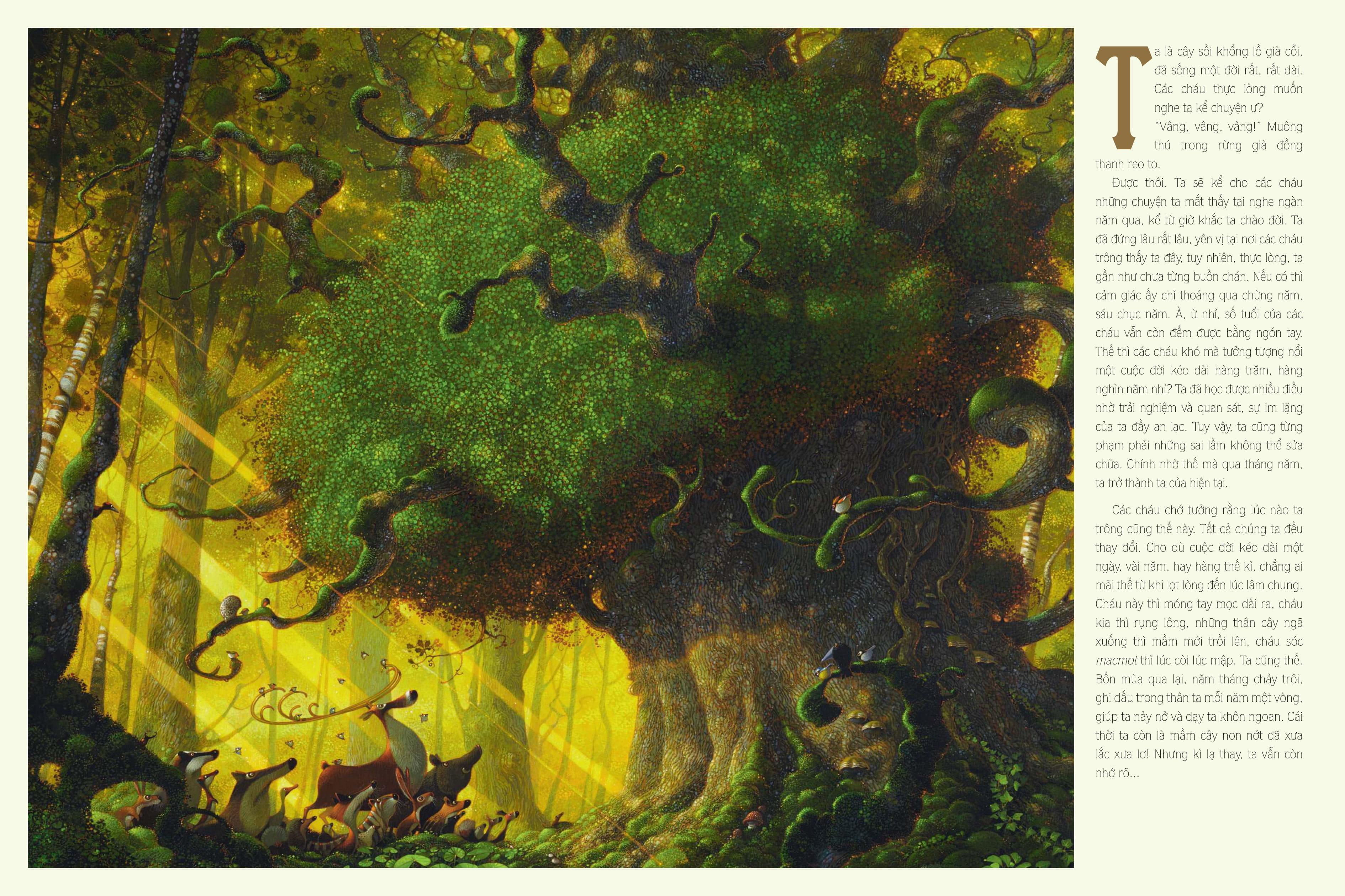 Cổ Tích Dưới Bóng Sồi Ngàn Tuổi Ta là cây sồi khổng lồ già cỗi, đã sống một đời rất, rất dài. Các cháu thực lòng muốn nghe ta kể chuyện ư? “Vâng, vâng, vâng!” Muông thú trong rừng già đồng thanh reo to. Được thôi. Ta sẽ kể cho các cháu những chuyện ta mắt thấy tai nghe ngàn năm qua, kể từ giờ khắc ta chào đời. Những câu chuyện thông tuệ của thế giới cổ tích diệu kì đầy an nhiên và ngạc nhiên dưới bóng sồi ngàn tuổi.