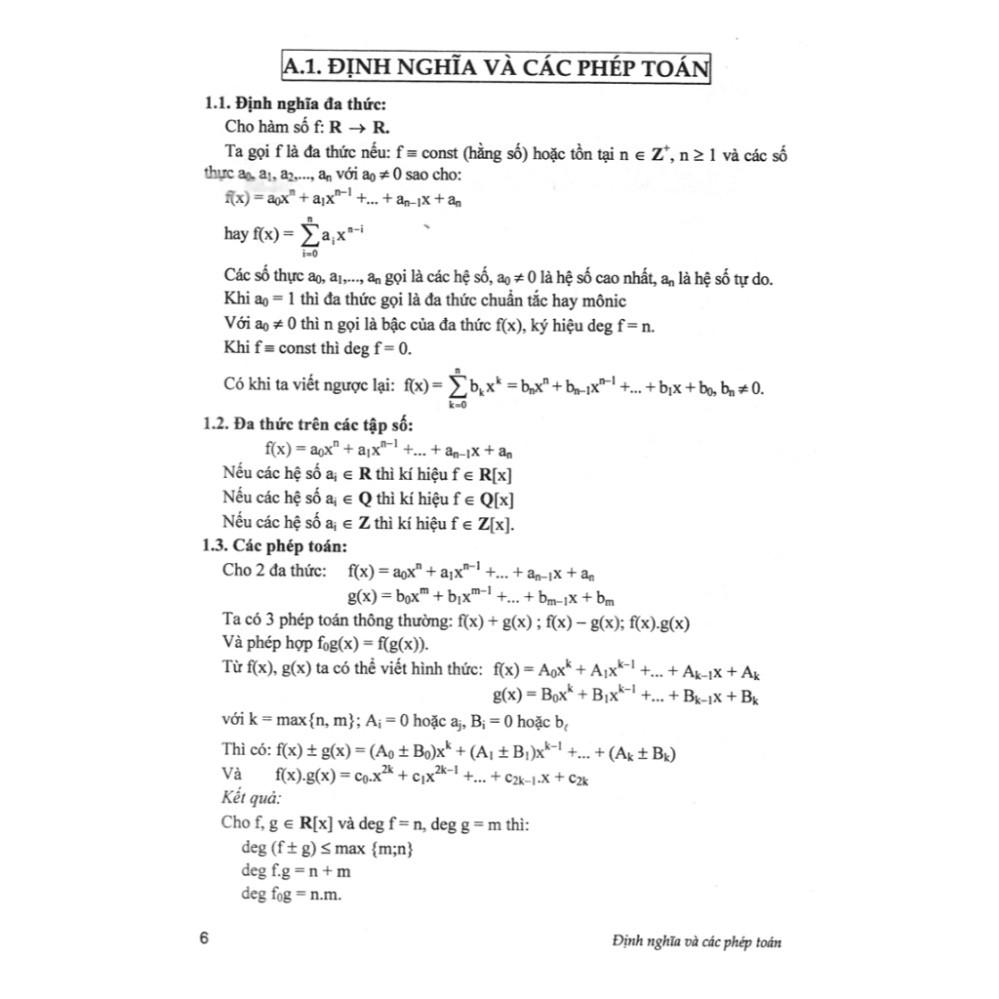 - Phần A là lí thuyết kèm theo khoảng 250 ví dụ cơ bản của 15 chuyên mục từ Đa thức với các phép toán đại số đơn giản đến đa thức hệ số phức, đa thức nhiều biến.