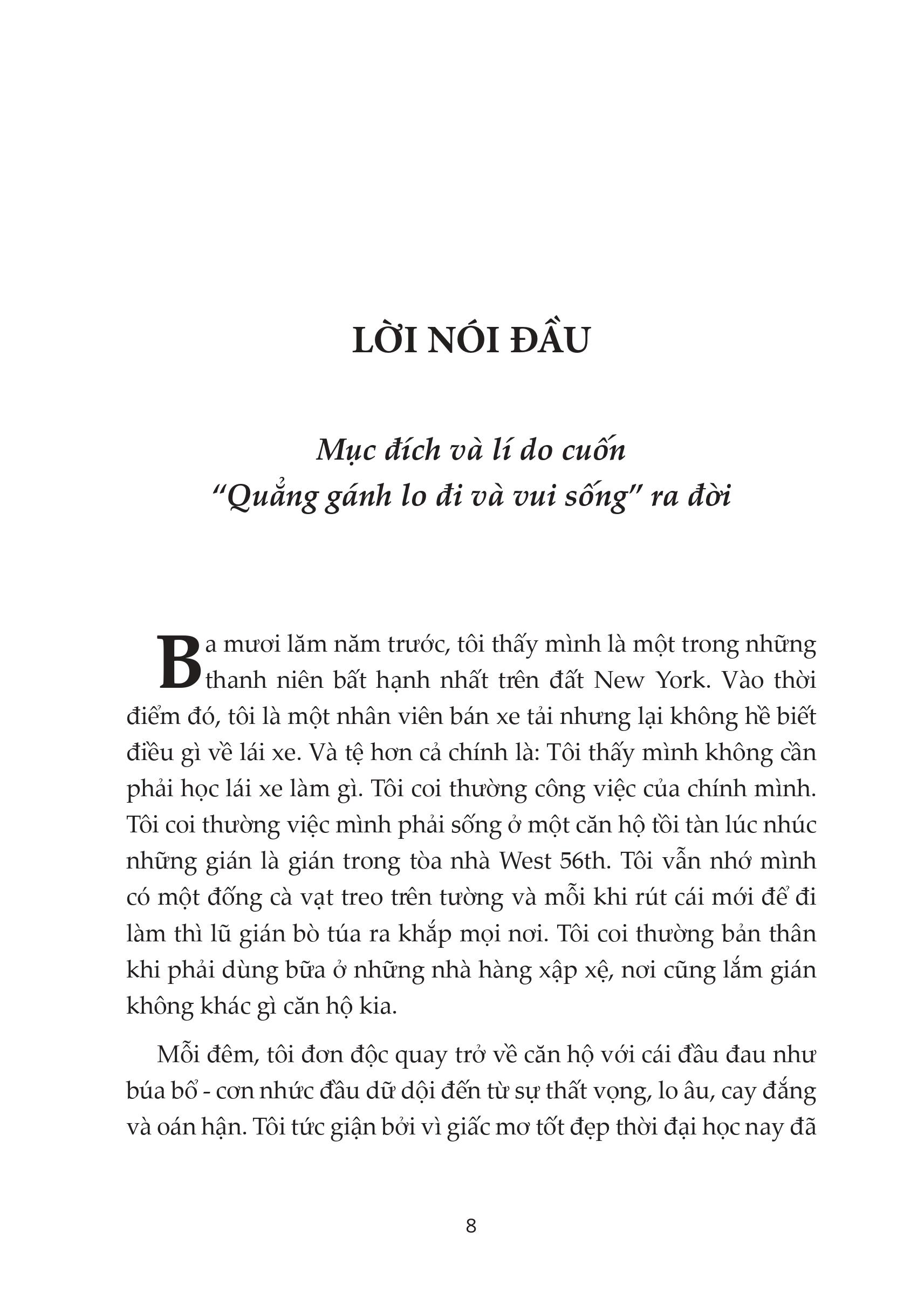- QUẲNG GÁNH LO ĐI VÀ VUI SỐNG Sau Đắc Nhân Tâm thì Quẳng gánh lo đi và vi sống (How to Stop Worrying and start living) là một trong những cuốn sách bán chạy nhất trên thế giới. Bất kỳ ai đang sống đều sẽ có những lo lắng thường trực về học hành, công việc, những hoá đơn, chuyện nhà cửa,... Cuộc sống không dễ dàng giải thoát bạn khỏi căng thẳng, ngược lại, nếu quá lo lắng, bạn có thể mắc bệnh trầm cảm. Quẳng Gánh Lo Đi Và Vui Sống khuyên bạn hãy khóa chặt dĩ vãng và tương lai lại để sống trong cái phòng kín mít của ngày hôm nay. Mọi vấn đề đều có thể được giải quyết, chỉ cần bạn bình tĩnh và xác định đúng hành động cần làm vào đúng thời điểm. Cuốn sách được viết ra bởi người tự nhận mình là "một trong những kẻ bất hạnh nhất New York " nhưng chỉ sau một thời gian ngắn bằng những nỗ lực vượt bậc của mình, ông đã trở thành 1 người xuất trúng được hàng triệu người biết đến. Cuốn sách là tập hợp các quy tắc giúp bạn giải quyết những cảm xúc tiêu cực, lo lắng và buồn bã. Không chỉ đưa được người đọc đến một cuộc sống thú vị và trọn vẹn hơn mà còn giúp chúng ta nhận thức rõ về bản thân và cả những người xung quanh SƠ LƯỢC VỀ NỘI DUNG