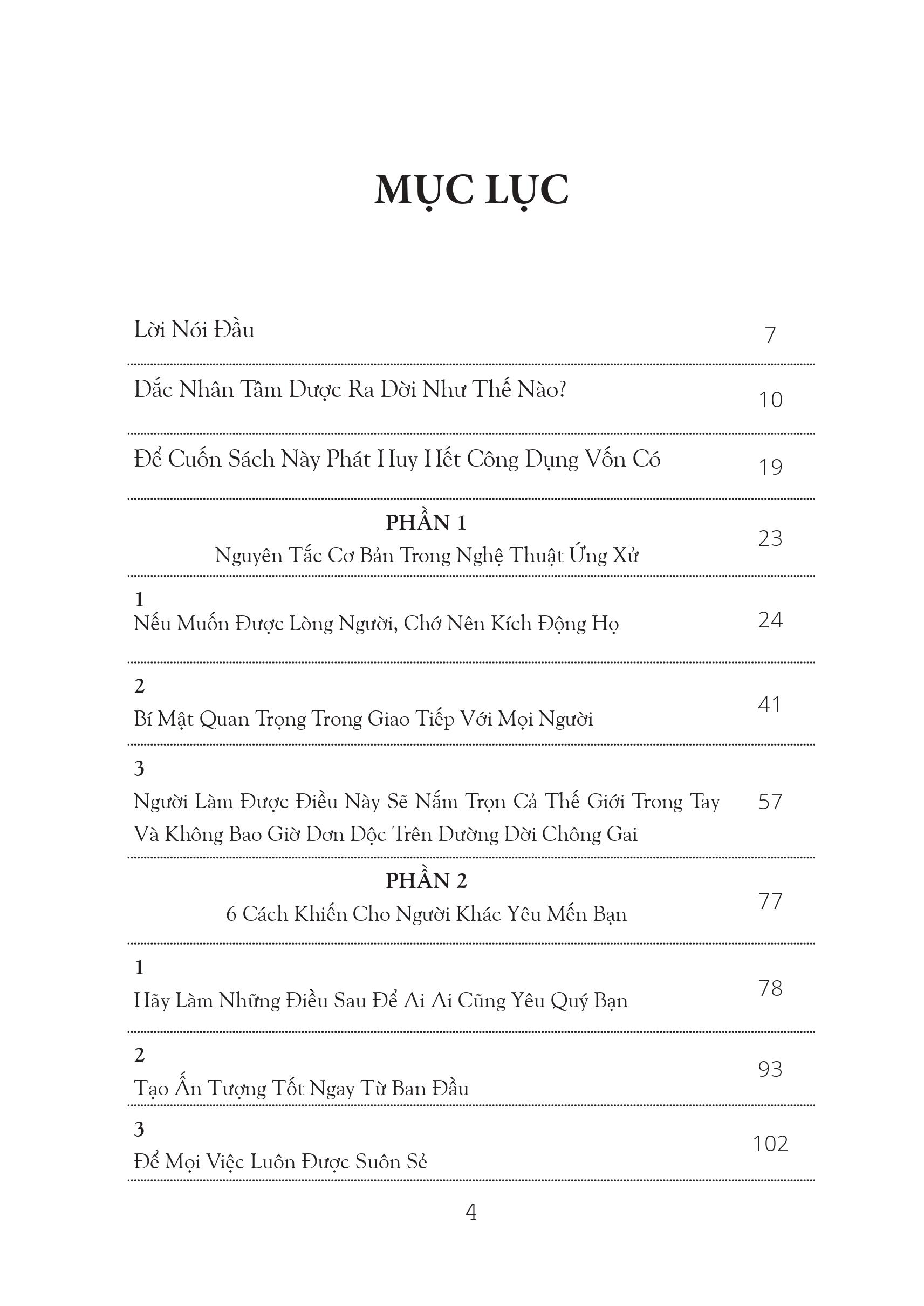 - ĐẮC NHÂN THÂM Cuốn sách bao gồm 4 phần giúp cho mỗi cá nhân sẽ có thể hiểu được nguyên tắc cơ bản về nghệ thuật ứng xử, giúp người khác yêu mến, ủng hộ quan điểm cũng như giúp bạn trở thành một nhà lãnh đạo tài ba. Phần 1: Nguyên tắc cơ bản trong nghệ thuật ứng xử Phần 2: 6 các khiến cho người khác yêu mến bạn Phần 3: Làm sao để người khác ủng hộ quan điểm của bạn Phần 4: Trở thành nhà lãnh đạo: thay đổi quan điểm của người khác mà không vấp phải sự phản bác