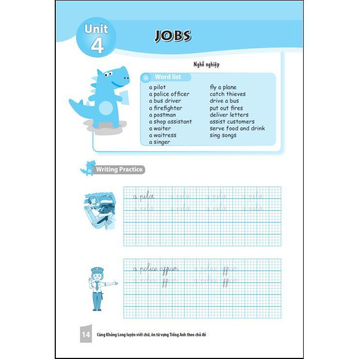 “Cùng Khủng Long Luyện Viết Chữ, Ôn luyện từ vựng Tiếng Anh theo chủ đề 4” giúp các con rèn luyện chữ qua các chủ đề quen thuộc: Hoạt động hàng ngày – Trạng từ tần suất – Nông trang – Nghề nghiệp – Các bệnh thường gặp – Các môn học – Nơi chốn – Quá khứ đơn/Động từ có quy tắc; bất quy tắc – Nội quy trường học.